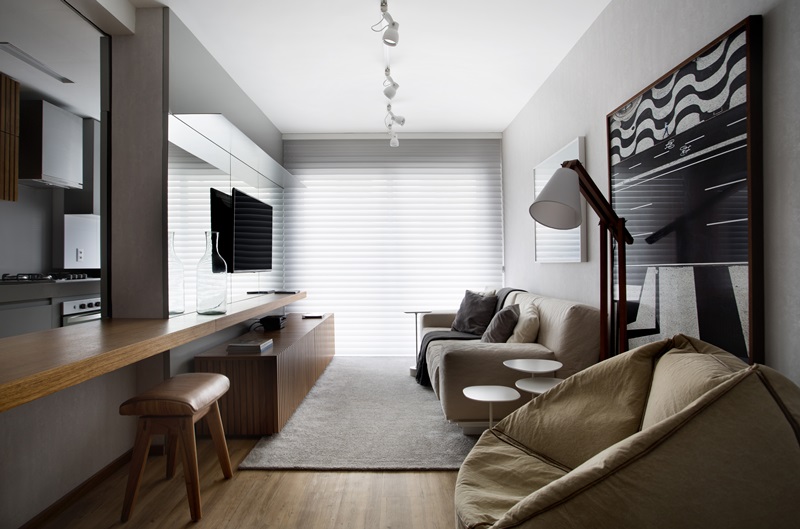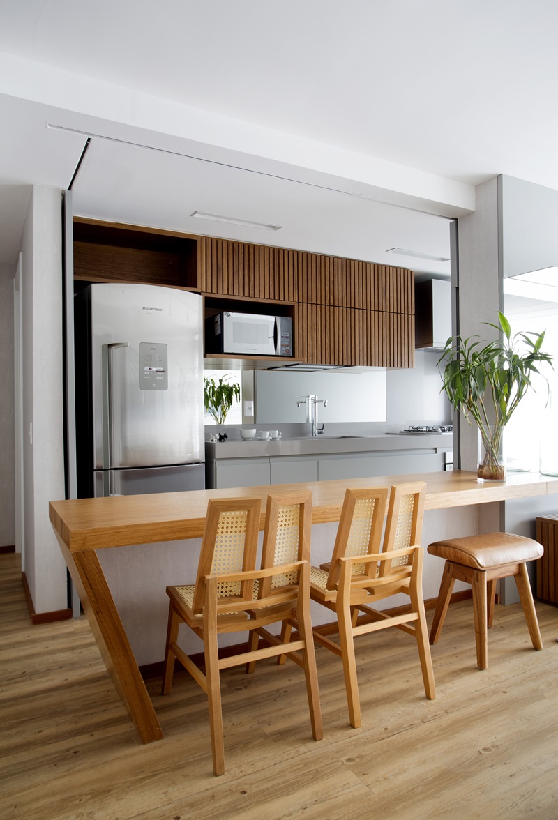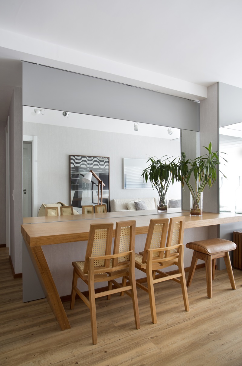 Toda a planta do apartamento foi mantida, a exceção da cozinha, que foi aberta para a sala e passou a contar com um painel de correr espelhado que vai do teto à bancada. “Este recurso permite isolar a cozinha quando necessário e ainda confere amplitude à sala”, ressalta a sócia Gabriela.
