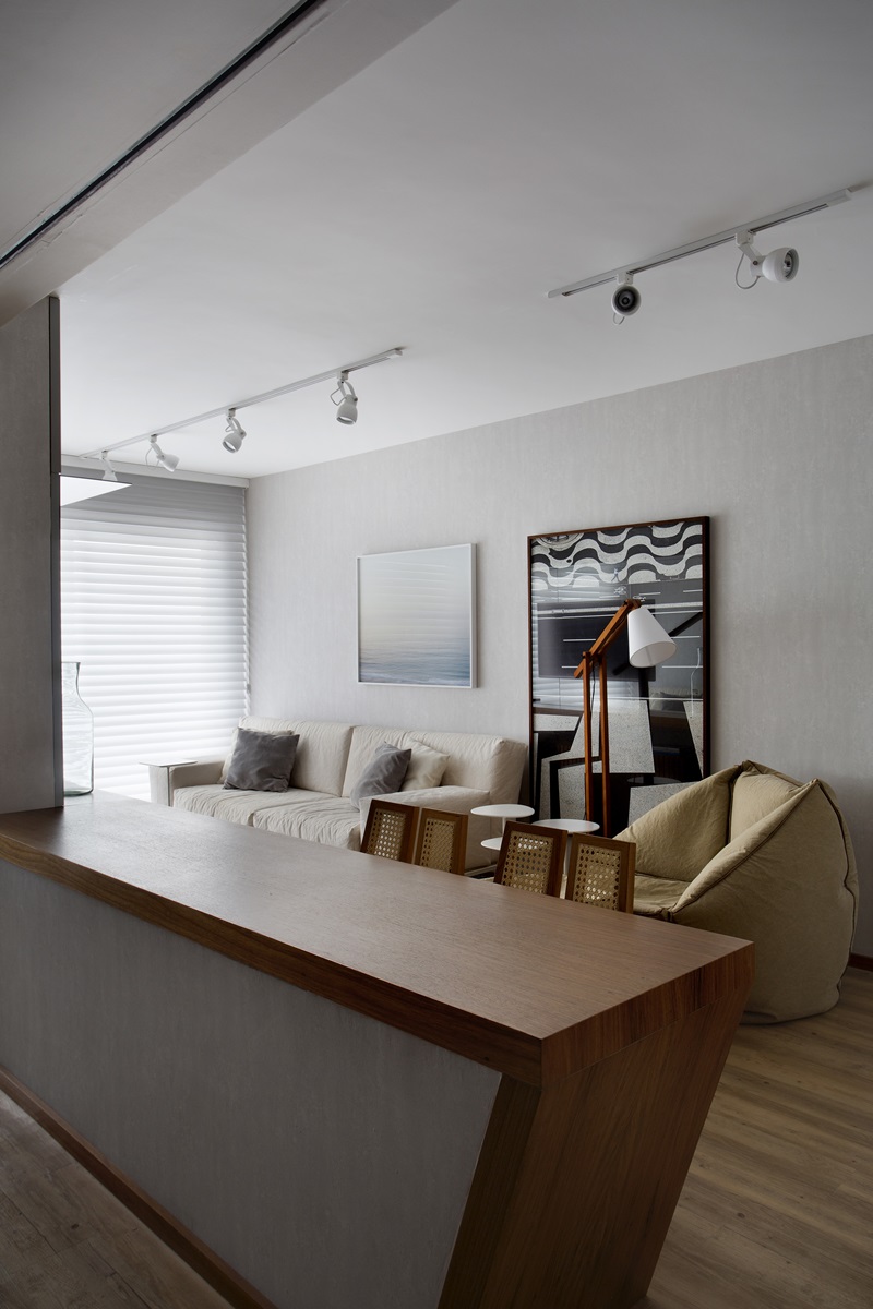 Com aspecto feio e frio, o piso original em cerâmica de todo o apartamento foi coberto com réguas de vinil no padrão amadeirado, deixando os espaços mais acolhedores. Já os revestimentos cerâmicos dos banheiros foram cobertos com cimento queimado. Toda a iluminação foi feita por trilhos aparentes e os móveis – maioria de design brasileiro assinado – foram garimpados na pronta-entrega de algumas lojas da cidade. Também para ganhar tempo, no lugar de repintar as paredes da sala e dos quartos, as arquitetas optaram por forrá-las com papel de parede. Já a marcenaria foi desenhada e instalada em apenas duas semanas.