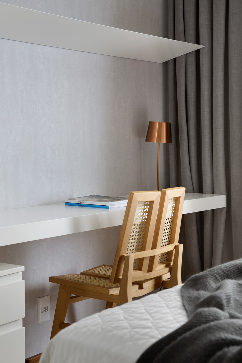 Desta vez, o projeto foi feito sob medida para um empresário estrangeiro na faixa dos 55 anos, morador das Ilhas Cayman que, por manter negócios no Brasil, decidiu ter um endereço fixo no Rio para servir de pouso em suas frequentes viagens para cá. “O principal desafio neste caso foi repaginar totalmente o imóvel em apenas um mês, evitando, ao máximo, o quebra-quebra e a sujeira típicos de uma obra”, conta ela.