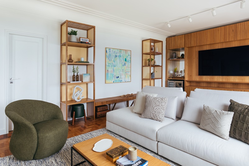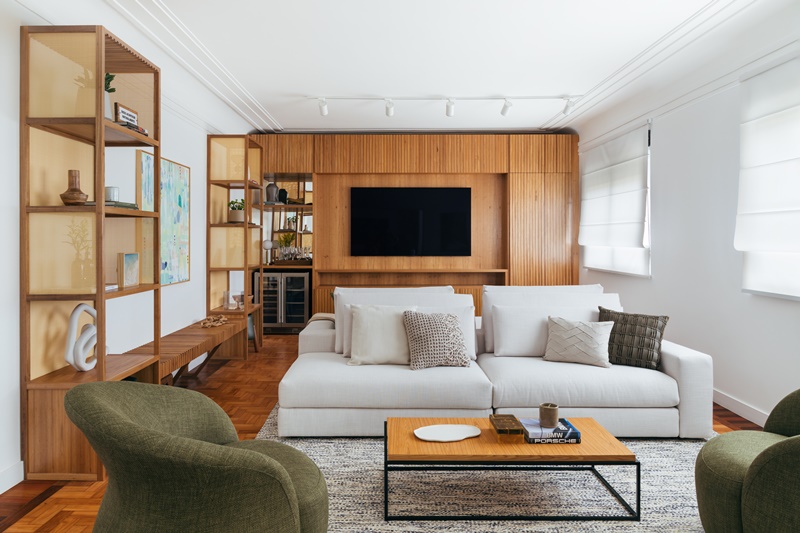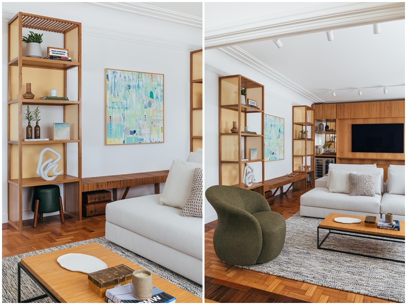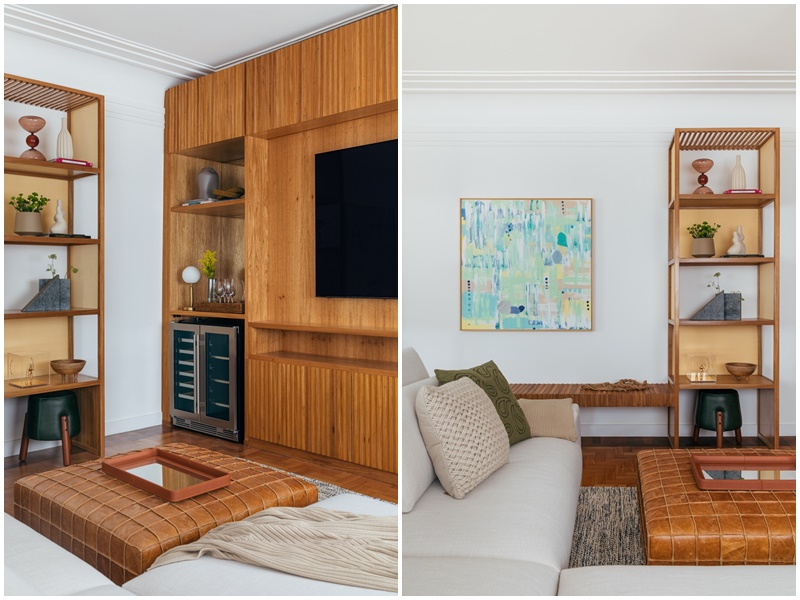 Vale também ressaltar a marcenaria como um grande diferencial do projeto. Ela marca presença no formato de lâmina natural de carvalho americano e detalhes em palha, e em vários móveis de autoria e desenho da própria arquiteta: o rack, a adega, a estante com banco que integra os ambientes de estar e TV, e o móvel de apoio da área gourmet.