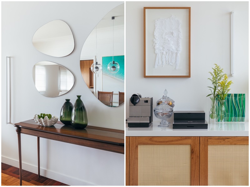 – Uma mudança significativa que fizemos foi no espaço da varanda. Aproveitamos para valorizar esse ambiente onde a vista é linda e criamos um espaço com uma pequena mesa que vale tanto para a família tomar café apreciando o mar, quanto receber amigos para um vinho. Trouxemos ainda mais o mar para dentro de casa através de um jogo de espelhos – diz Fernanda.