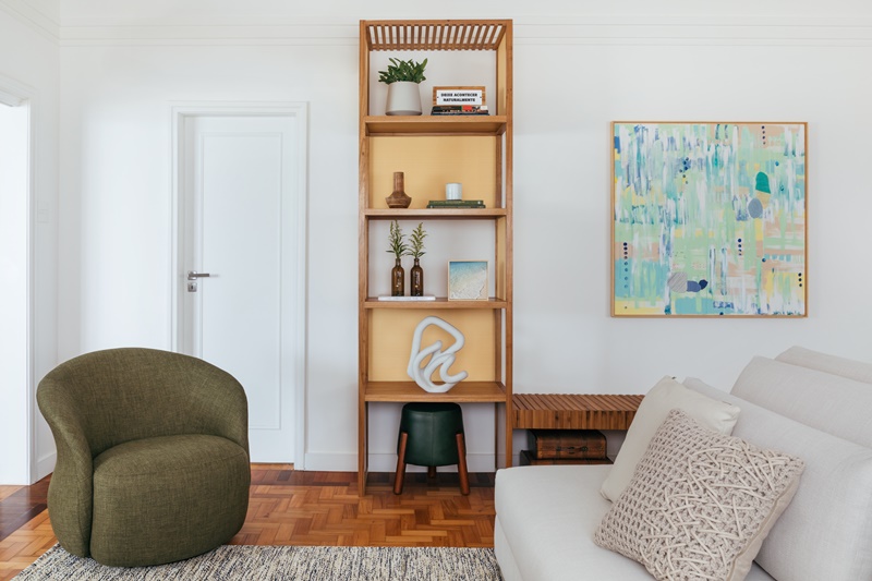 Durante o processo da obra (que durou apenas dois meses para ser concluída) alguns aspectos originais do edifício dos anos 1960/1970 foram preservados. O pé direito generoso e detalhes como a sanca e o piso de madeira em Peroba do Campo ficaram intactos, se misturando a outros elementos mais contemporâneos trazidos ao projeto.