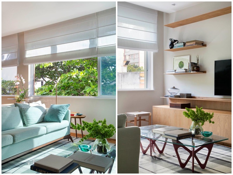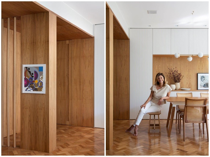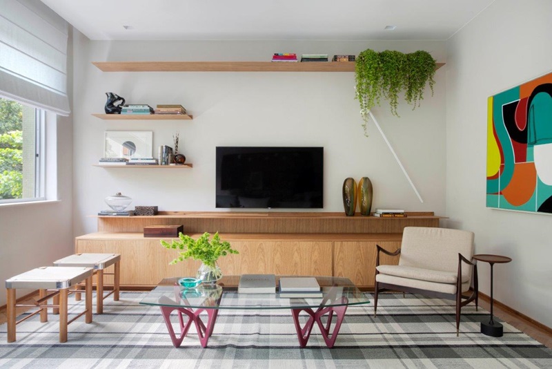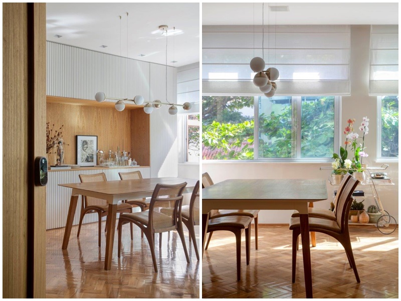 Este projeto reflete o amadurecimento e a atemporalidade dos projetos mais recentes do escritório Da Hora Arquitetura, que busca combinar cores neutras e claras com muita madeira, sempre destacando peças de design assinado. A arquiteta também tem se empenhado em aproveitar, no projetos novos, ao máximo peças de boa qualidade e também as herdadas de família, de valor afetivo, que os moradores já tinham em casa. No caso deste projeto, por exemplo, vieram do apartamento anterior o quadro colorido ao lado da estante da sala, os sofás (que foram reformados), a mesa de centro, a mesa de jantar e as cadeiras, o carrinho de chá, entre outros móveis.