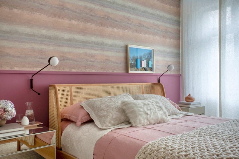 A cliente pediu um quarto alegre e alto astral, que são características de sua própria personalidade. A arquiteta propôs pintar a parede atrás da cama com tinta magenta até meia altura (Coral Del Monte) e completar até o teto com papel de parede da Orlean, em tons rosados. A cabeceira da cama em palhinha, com laterais curvas, confere delicadeza e leveza ao conjunto, evocando o aconchego típico de uma casa de campo.