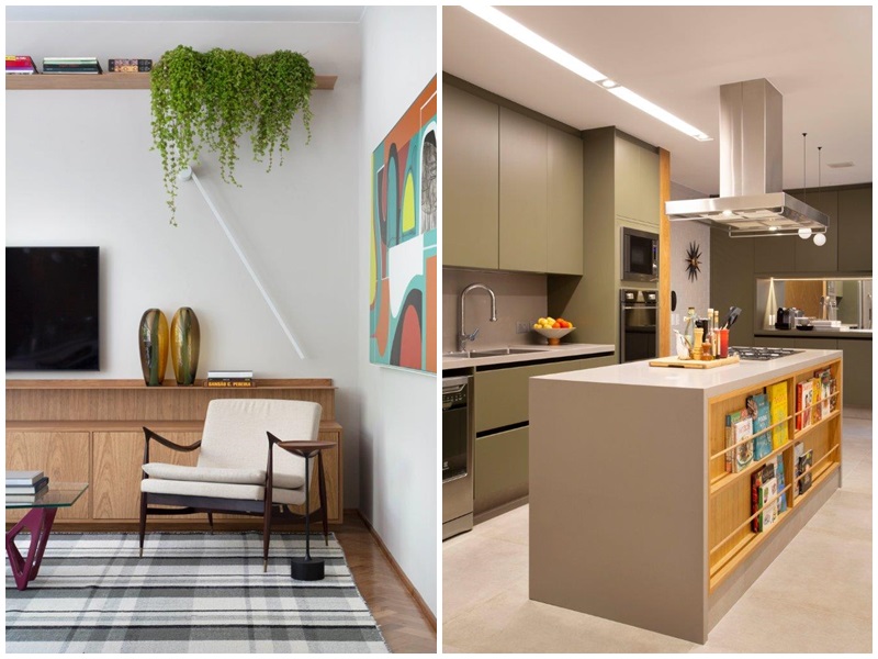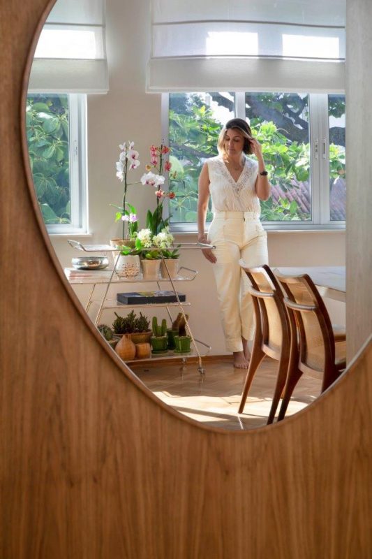 “O resultado da marcenaria como um todo, com destaque para o armário embutido em frente à mesa de jantar, que é multifuncional. Também adorei o carrinho de chá que veio do outro apartamento e transformamos em uma linda floreira na sala”.