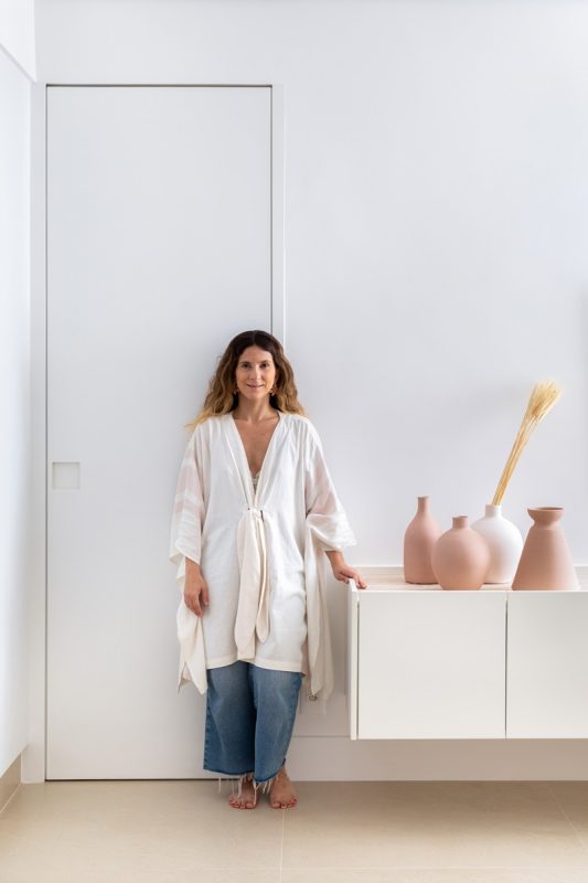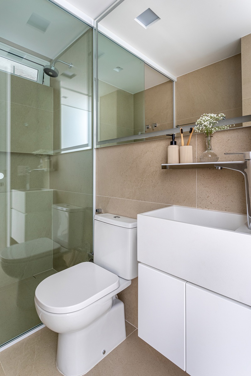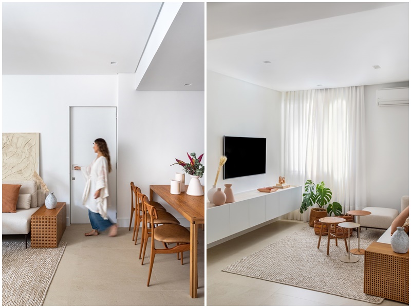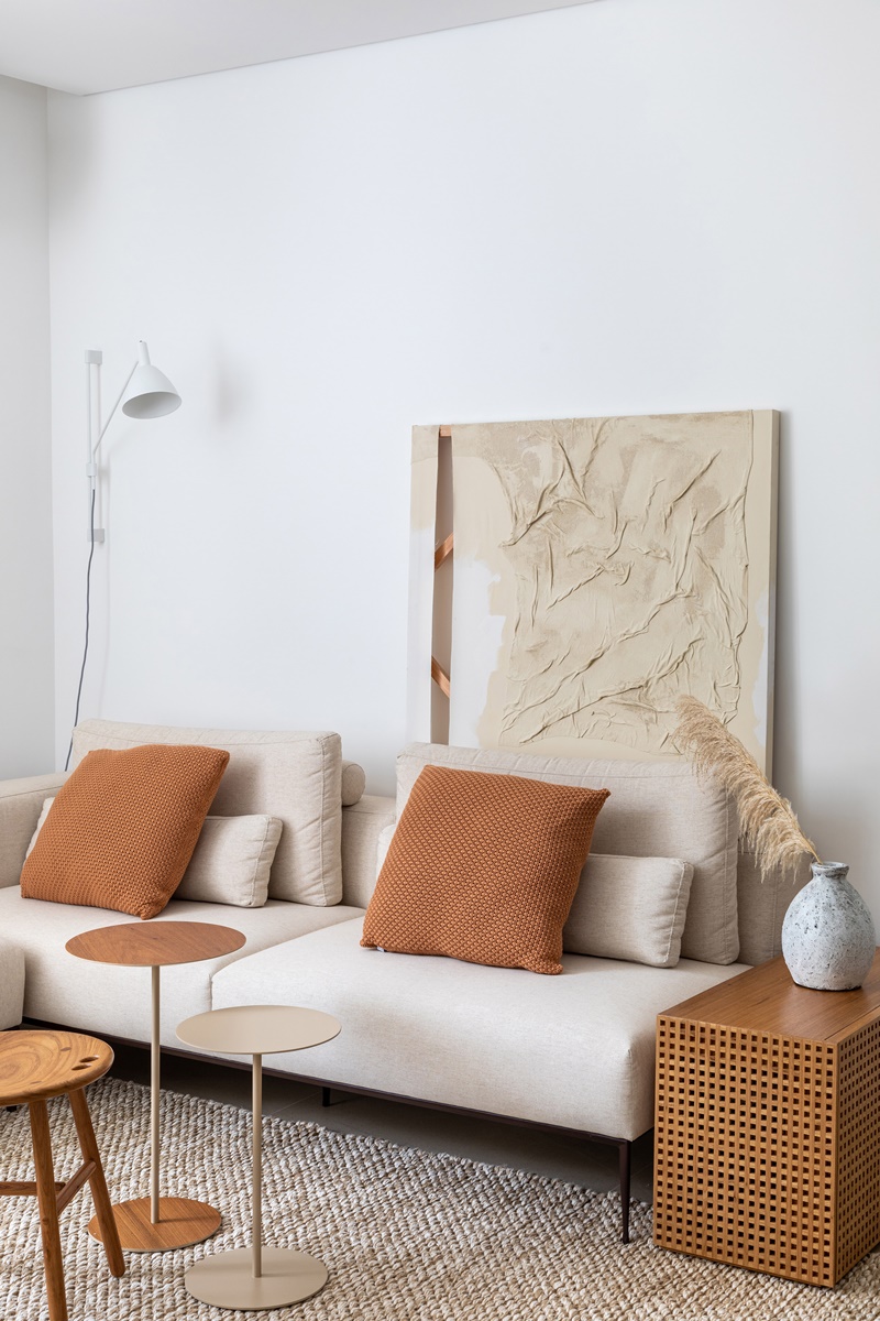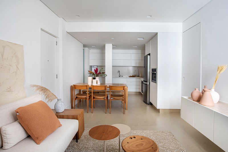 Em termos conceituais, o projeto aposta em uma arquitetura simples e atemporal, com farta luz natural. Em todo apartamento foi utilizada a mesma paleta de tons neutros e claros, com predomínio do branco nas paredes e no acabamento da marcenaria para ressaltar tanto os móveis de linhas puras como os adornos produzidos em materiais naturais, como madeira, cerâmica e fibra. Até o piso de porcelanato (Karst, da Portobello, em tom nude) presente em todo o apartamento – da sala à cozinha, passando pelos quartos e banheiros – lembra uma pedra natural (limestone), trazendo um toque de aconchego aos espaços, mas sempre livre de excessos.