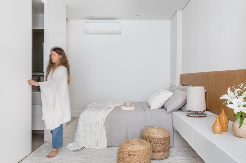 Na decoração, que é integralmente nova e segue o estilo minimalista essencialista, vale destacar alguns móveis brasileiros de design assinado, como a mesa Caetano e o banco Helena, ambos de Aristeu Pires, e o banco Angela, de Fernando Mendes. Já na marcenaria, a cereja do bolo é a porta de correr que dá acesso ao banheiro da suíte e vai do piso ao teto, camuflada no painel de marcenaria branca que reveste a parede em frente a cama.