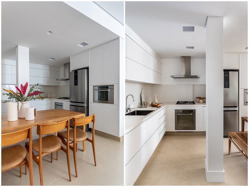 “Nosso maior desafio foi integrar a sala com a cozinha, já que durante a obra encontramos uma coluna de tubulação de gás do prédio que não poderia ser remanejada, nos obrigando a alterar o projeto original. Felizmente, no final deu tudo certo e a cliente amou o resultado“, finaliza Janaina.