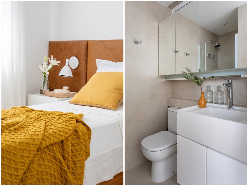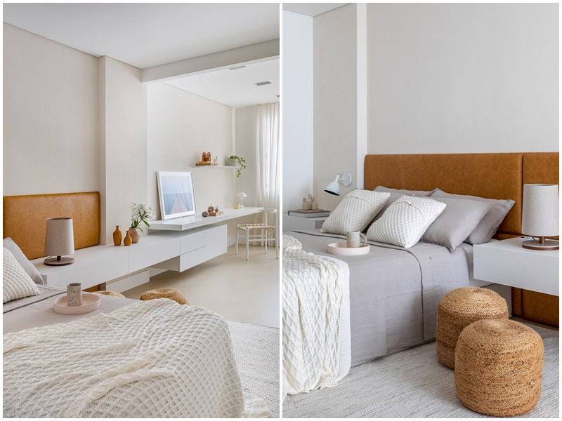 Segundo a arquiteta, a integração e a multifuncionalidade dos ambientes foram os pontos mais importantes do projeto. “Como a cliente passou a trabalhar em casa na pandemia e permanece até hoje, ela queria integrar um dos quartos com a suíte para criar um espaço de trabalho confortável, com bastante luz natural“, conta ela. “Outro pedido foi um quarto de hóspedes aconchegante para acomodar os dois hóspedes que ela recebe com frequência“, acrescenta.