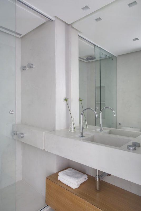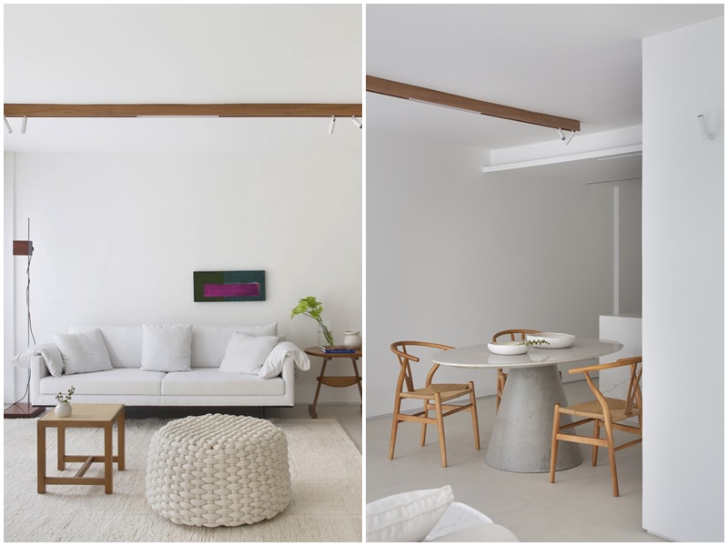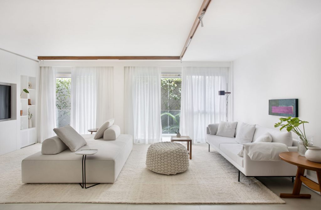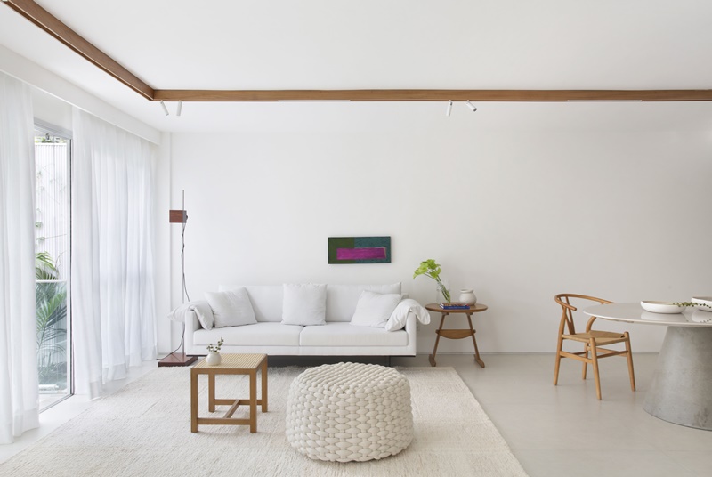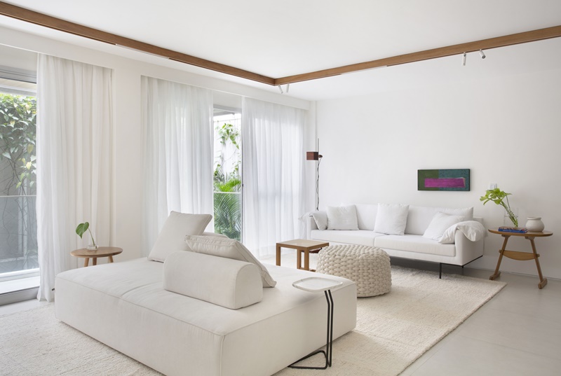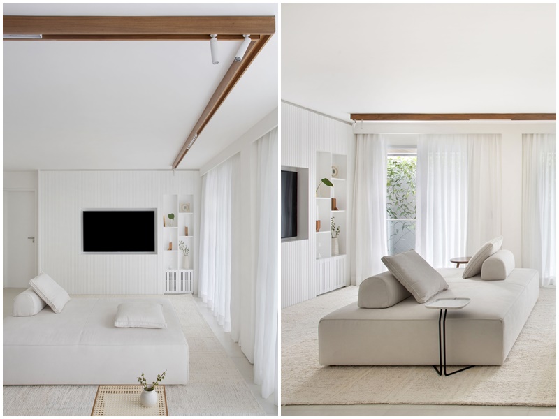 De estilo contemporâneo, clean e minimalista, a decoração é integralmente nova. Repare como o escritório apostou em materiais naturais e abusou da cor branca e tons off white para aumentar a luminosidade e a sensação de leveza. “Na sala, no quesito mobiliário, nossa seleção é um mix de poucas peças grandes com outras menores e versáteis que podem passear facilmente pelos ambientes, incluindo algumas de madeira. Em comum, todas primam pela atemporalidade e conforto“, informa Diego, destacando o sofá Rocco de Luan del Savio, a mesa lateral Lina de Fernando Mendes, a luminária Thor de Arthur Moreno, o banco Toti de Bernardo Figueiredo e o sofá em ilha, com assentos voltados para o living e para o painel da tv, em marcenaria ripada com acabamento em laca branca. “Este sofá pode ser usado também como cama de hóspede, atendendo ao pedido inicial dos clientes“, ressalta.
