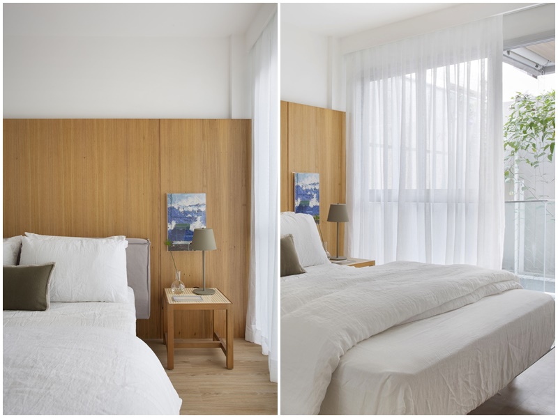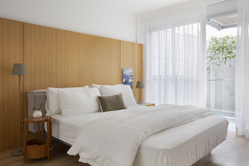 Diferentemente da sala, cujo piso é de porcelanato acetinado off white, o quarto do casal ganhou piso madeirado e painéis de madeira atrás da cama para trazer aconchego e acolhimento, além da cama Less, do Estudiobola, com cabeceira estofada em lona cinza. No lugar dos tradicionais gaveteiros laterais, foram usados uma mesa de apoio e um banco com assento de palhinha, fazendo um conjunto interessante com as luminárias Piccolo, da Lumini, na versão de piso de um lado e de mesa do outro.