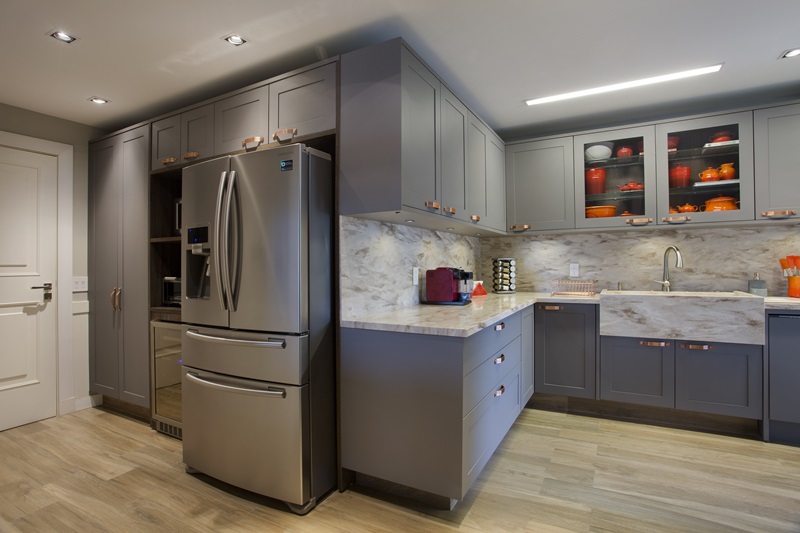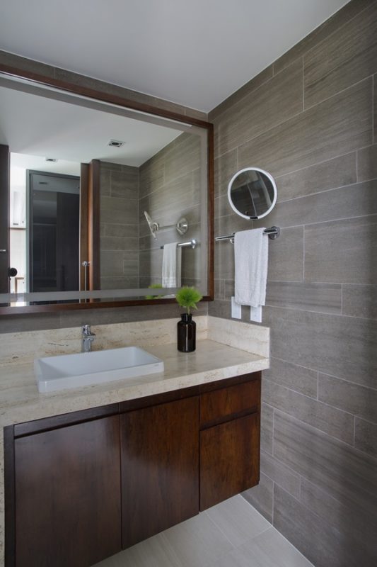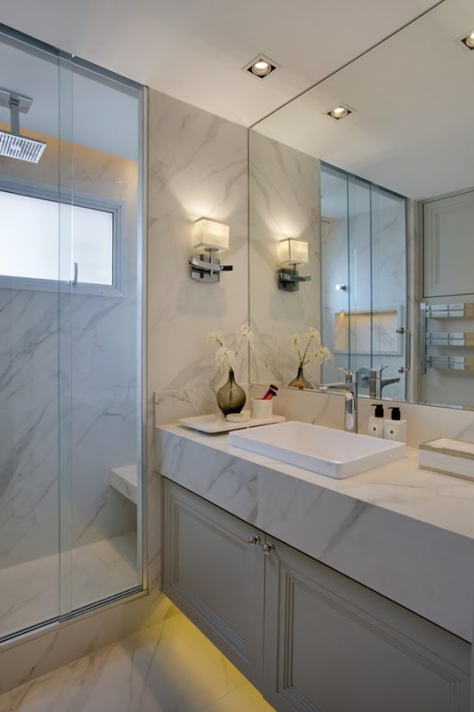 No projeto, praticamente 40% da planta foi alterada. Um dos 4 quartos foi incorporado à suíte do casal, abrindo espaço para incluir no cômodo um closet e um banheiro para cada cônjuge. A parede da sala que dava para a cozinha foi demolida para integrar os dois ambientes.