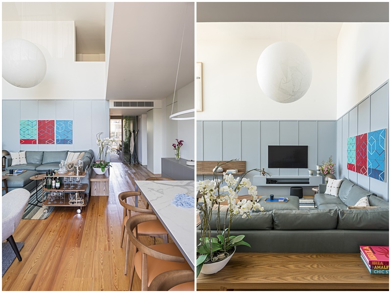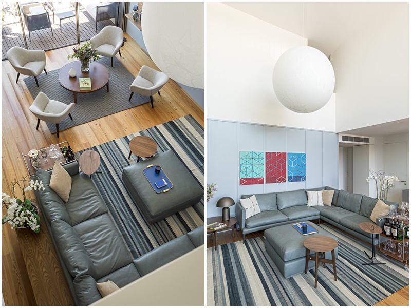 Outra solução interessante foi a escolha de uma grande luminária em formato de bola que pende da parte mais alta do teto no estar.