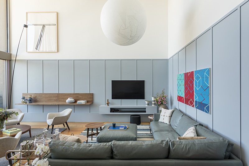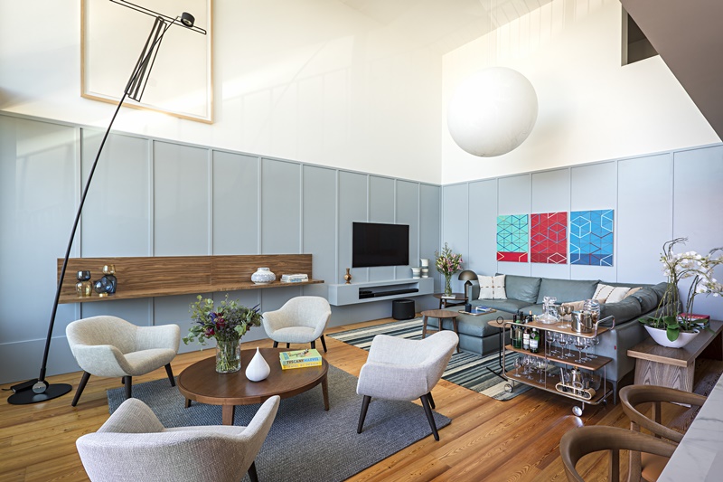 Para chegar nesse resultado, Andrea usou como ponto de partida o sofá. Em couro, num tom azul acinzentado, foi ele quem determinou a paleta de cores da área social do imóvel, que tinha uma configuração complicada por ter um jirau – onde estão os quartos -, e um pé-direito muito alto na sala de estar. Para trazer aconchego ao espaço, a arquiteta dividiu a parede em dois, criando boiseries na parte mais baixa que ganharam uma pintura num azul claro complementar ao tom do sofá. A parte superior foi mantida branca.