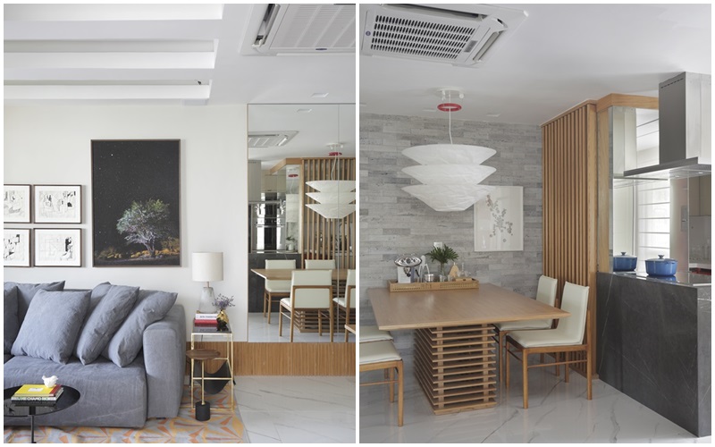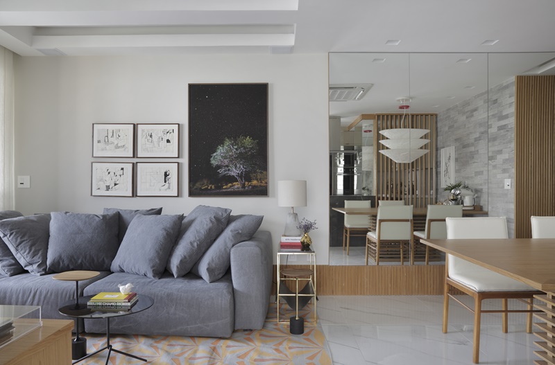 Localizado em Ipanema, RJ, o apartamento de 150 m² possui 2 quartos, sendo um deles suíte; sala, cozinha americana, banheiro social e varanda. A reforma foi completa, incluindo mudanças no projeto de arquitetura do apartamento. A obra, para atender ao casal de empresários, na faixa dos 30 anos, durou 4 meses.