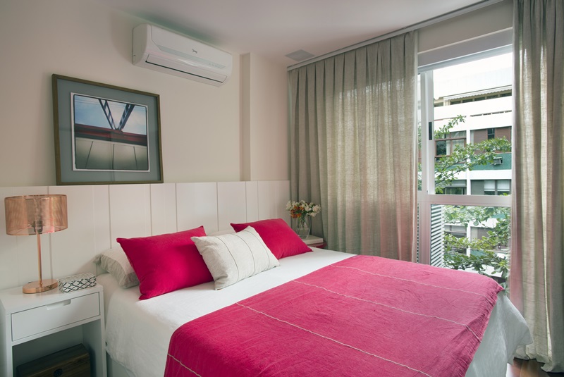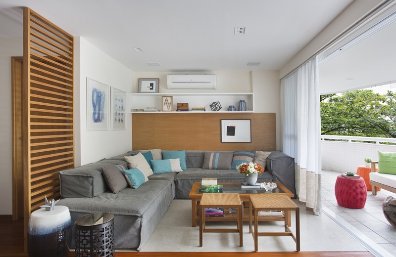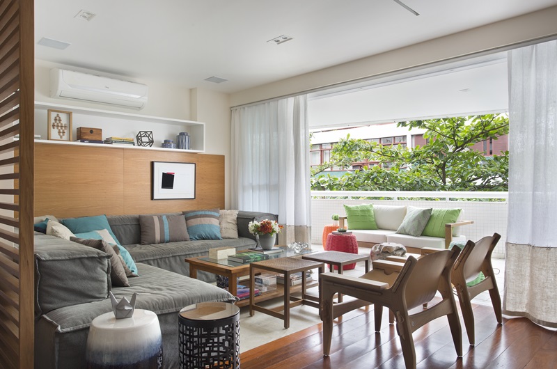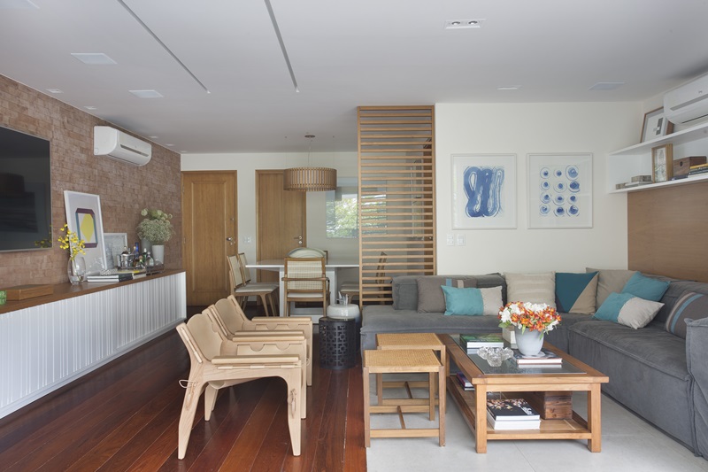 O apartamento, localizado no Leblon e originalmente com quatro quartos teve todos os cômodos trabalhados e um quarto demolido para a ampliação da sala.