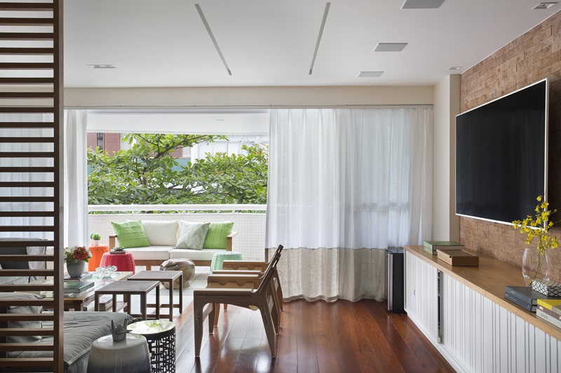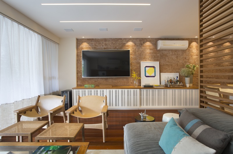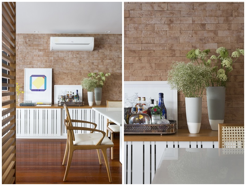 Sendo o primeiro apartamento do casal, eles queriam que a decoração refletisse sua personalidade, que fosse aconchegante, prático e de fácil manutenção, sem frescuras. Mas com conforto, design e arte. Para atingir esse resultado, foram utilizados materiais naturais como madeira, palha, linho e couro, além do revestimento da parede principal com tijolinhos rústicos. O piso original de madeira da sala foi mantido e a parede atrás do sofá em L foi revestida em freijó.