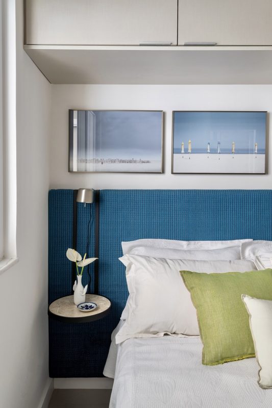 O objetivo principal do novo projeto foi criar um apartamento prático, leve e descontraído, uma vez que se trata de um imóvel de temporada. No décor, os arquitetos se inspiraram no próprio Rio de Janeiro, inserindo fotografias da praia e adornos em tons de azul e verde para pontuar a base neutra.