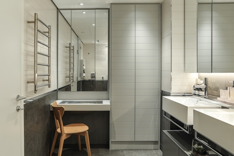 O closet do quarto, por exemplo, foi ampliado. E até uma área do corredor da suíte do casal foi aproveitada para criar um armário estreito para guardar sapatos e bolsas.