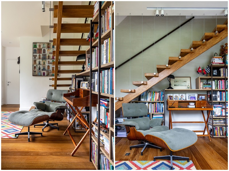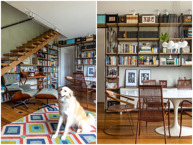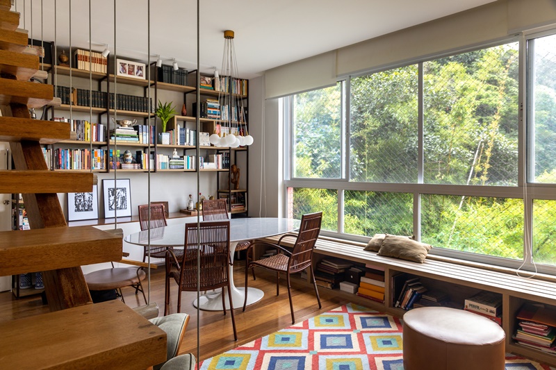 Como os clientes tem muitos livros e adoram ler, eles queriam um ambiente com função de biblioteca longe do agito da casa. E também pediram para que a sala de jantar ficasse próxima à cozinha principal. A partir daí, a arquiteta propôs integrar os dois espaços, uma vez que a mesa de jantar também poderia servir de apoio de leitura ou estudo. Com estrutura vazada de alumínio que lembra aço cortén e prateleiras de madeira rústica, as estantes de livros piso-teto foram projetadas pela arquiteta especialmente para o espaço, tornando-se um elemento de destaque no décor. De resto, ela mesclou peças que já faziam parte do acervo da família com novas. Já eram deles, por exemplo, a poltrona Lounge by Charles Emmes (que foi reformada), a mesa de jantar Saarinen, as cadeiras de jantar em ferro e fibra natural, a escrivaninha sob a escada, os adornos e os livros. Para completar o espaço, foram adquiridos não só estante como também o tapete, o extenso banco sob a janela, os cabos de aço fixados nos degraus da escada e os itens de iluminação. Um móvel antigo baixo que também já era da família (de madeira escura, portas espelhadas e estilo clássico) foi repaginado com novo acabamento, em laca num tom amarelo.