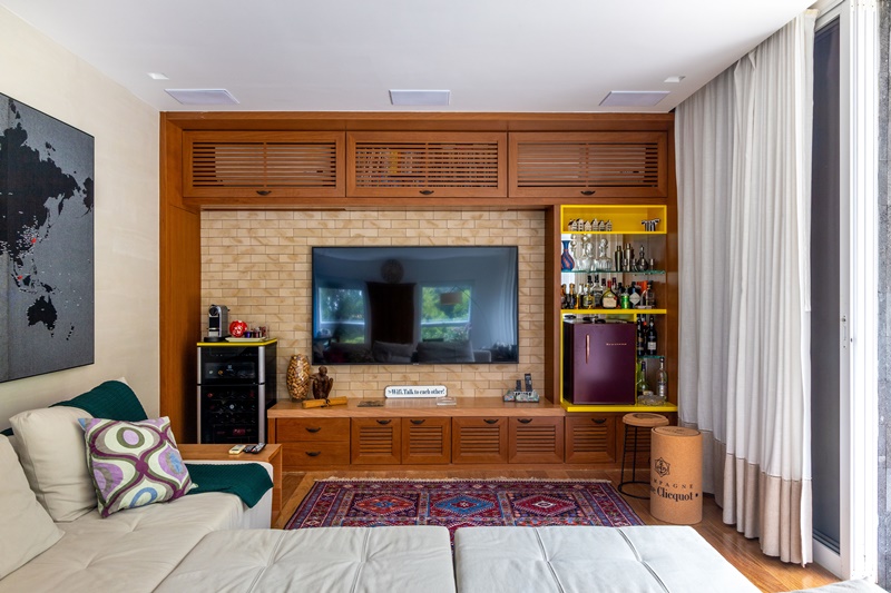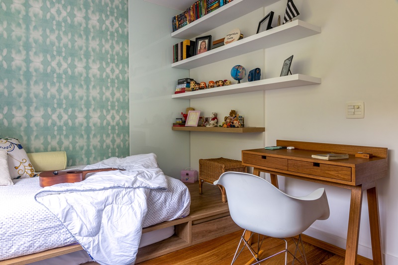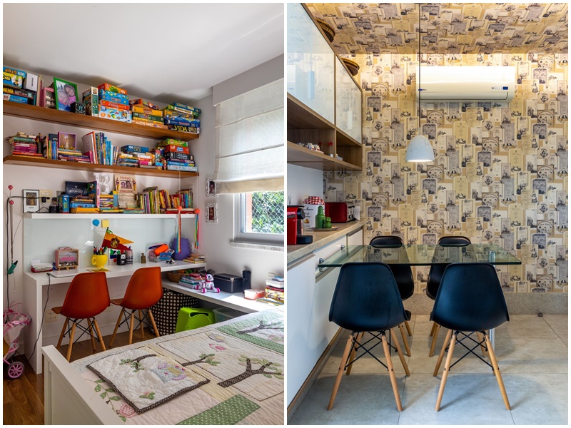 Na decoração, a maioria dos móveis foi reaproveitada tanto de residências anteriores como do guarda-móveis que a família alugava quando mudava de país. Como o atual apartamento é definitivo, a arquiteta Ketlein Amorim lançou mão de todo o acervo, mesclou as peças que melhor se harmonizavam no novo projeto e complementou com novas aquisições. “Itens como papéis de parede, revestimentos cimentados e tapetes coloridos ajudaram a criar a nova identidade do apartamento“, avalia ela.