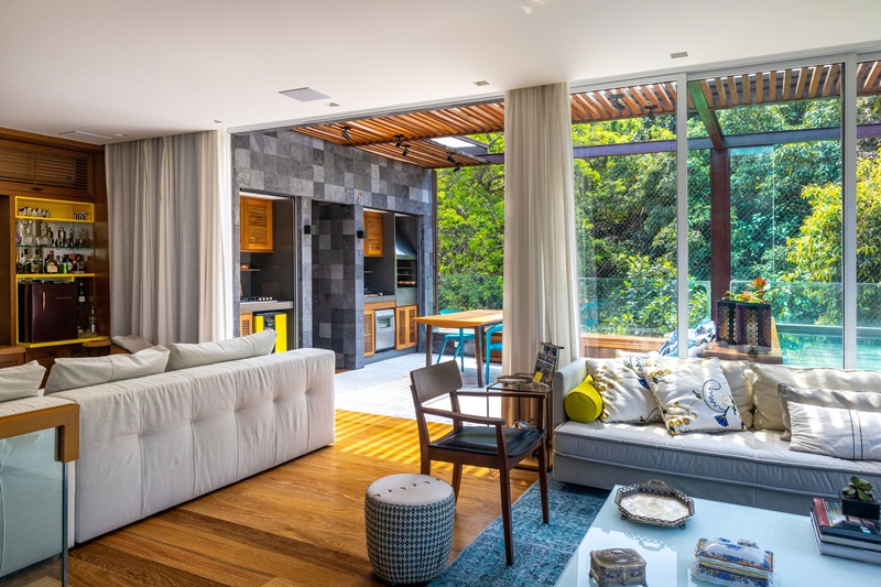 Na área externa do terraço da cobertura foi instalada uma máquina de lavar louça menor, bem ao lado da pia, já que a anterior ficava distante e não era funcional. O vão deixado sob a bancada foi então preenchido com uma cervejeira para que, em dias de casa cheia, os convidados se sirvam da bebida sem atrapalhar o churrasqueiro. Um grande banco de madeira foi projetado na parede do guarda-corpo de vidro, com espaço embaixo para armazenar material de piscina. Já a nova mesa serve tanto de apoio para o churrasqueiro como para refeições ao ar livre.
