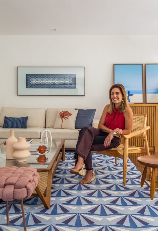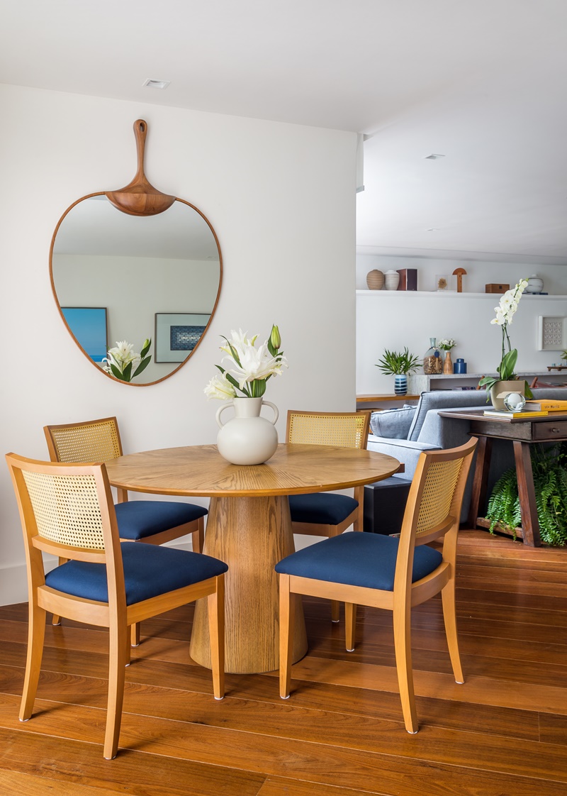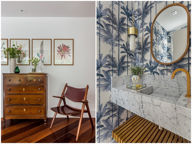 A madeira é, aliás, o principal elemento do projeto, presente não só no piso original de tábua corrida como também na maioria dos móveis e no acabamento da marcenaria desenhada pela arquiteta. Para equilibrar este material “quente”, ela pontuou o décor com elementos em tons frios de azul, com destaque para o tapete de estampa geométrica, algumas almofadas, quadros, assento de cadeiras, adornos e o papel de parede do lavabo, trazido de Londres. “O tapete trouxe um ar contemporâneo e jovem ao ambiente e ajudou a suavizar a presença de elementos clássicos, como a tábua corrida, o mármore Carrara e os móveis antigos“, avalia Fernanda. “No geral, procurei valorizar objetos, obras de arte e móveis de boa qualidade que já faziam parte do acervo da casa, a exemplo da escrivaninha, a cômoda do século passado e as gravuras da botânica Margareth Mee, e mesclar tudo com peças contemporâneas, de design assinado, como o banquinho Mocho, de Sergio Rodrigues, o espelho de parede Chuva, de Leo Romano, e banco Neocloud, de Humberto da Mata“, exemplifica ela. O resultado é um ambiente contemporâneo e afetivo, com poucas informações arquitetônicas.