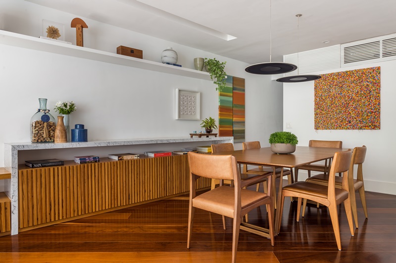 A arquiteta manteve o layout da planta da área social, já que seu formato original em Z permitia setorizar bem os ambientes e, ao mesmo tempo, integrá-los. Ela projetou um extenso móvel de marcenaria que percorre as paredes da sala de tv e de jantar, unindo visualmente os ambientes, ora servindo de banco (sob a janela) ora de rack (sob a tv) ora de buffet de apoio na área do jantar.