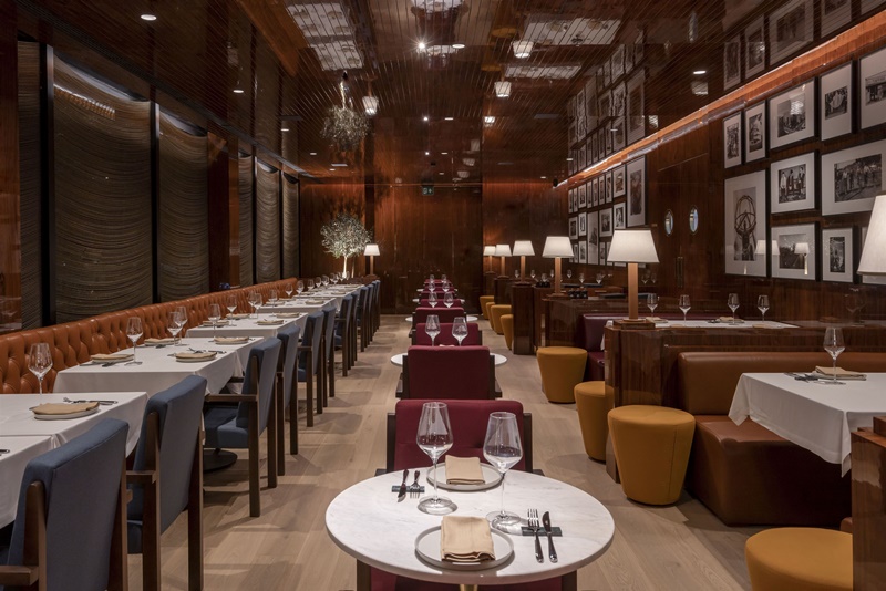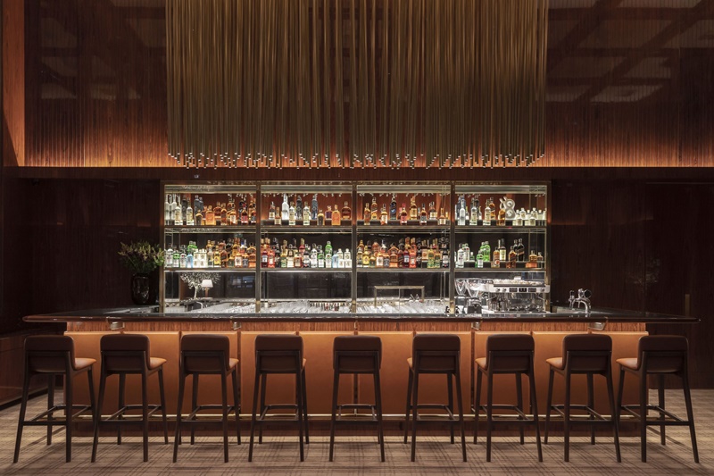 Elemento central do projeto, as lâminas de madeira pau ferro em alto brilho preenchem todo o salão, somando aproximadamente 350m² do revestimento. O projeto de arquitetura também lançou mão de recursos de iluminação impactantes: 224 tubos de alumínio com pintura dourada, dispostos sobre a bancada do bar em um pé direito de 5,7m, criam uma atmosfera ainda mais atraente. Nas paredes, fotos do acervo pessoal da família Zaffari compõem a narrativa da experiência.