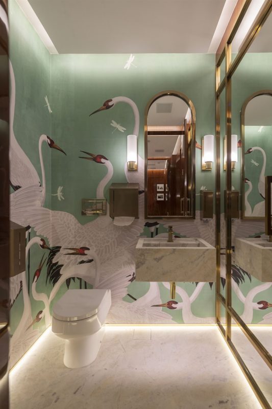 Estampado com garças e libélulas sobre fundos rosa e verde suaves, os papéis de parede dos toaletes são da linha décor da Gucci e trazem ares lúdicos ao ambiente. Além disso, carpete, móveis e adega foram desenhados pelo arquiteto Sig Bergamin com exclusividade para o Benjamin. “Cada elemento foi cuidadosamente selecionado para agregar camadas de sensações ao espaço. O carpete, por exemplo, não é apenas uma escolha estética; ele traz um aconchego inigualável ao ambiente. Ao caminhar sobre ele, os visitantes sentem uma suavidade sob os pés, tornando a experiência não apenas visual, mas também tátil.