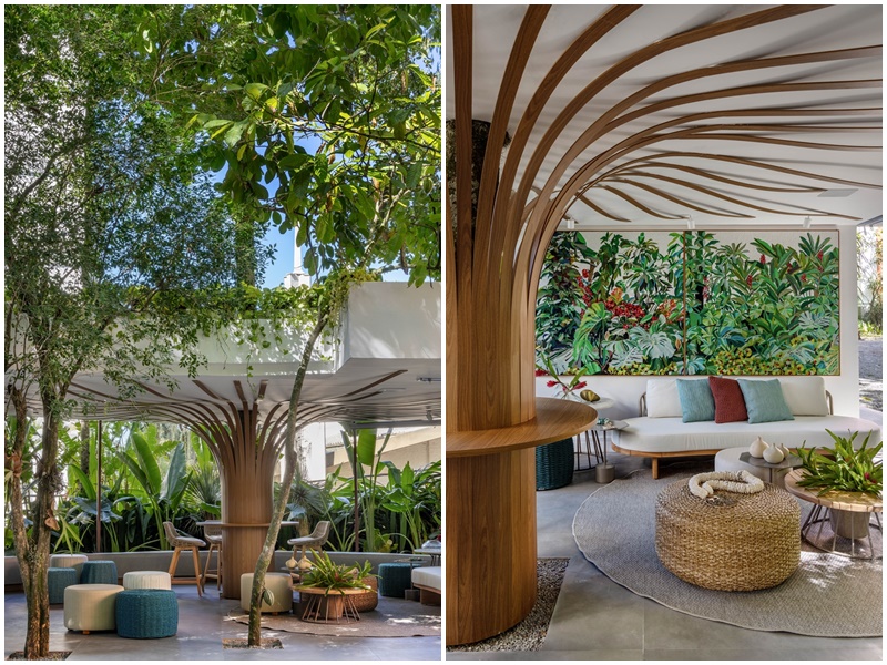 Uma árvore confeccionada em bambu no centro do ambiente sintetiza a aposta na biofilia do “Lounge das Boas-Vindas” das arquitetas Ana Cano e Vivian Reimers.