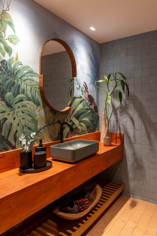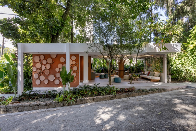 Criado para ser um lugar de descanso e encontro com os amigos, tem um décor repleto de elementos naturais como bambu,  barro reciclado, que cobre os nichos da estante existente; pedras e tramas. Além disso, ele segue a paleta de cores do jardim com verdes e terrosos e tem mobiliário de formas orgânicas. Um jardim bordado em miçangas de Mucki Skowronski.