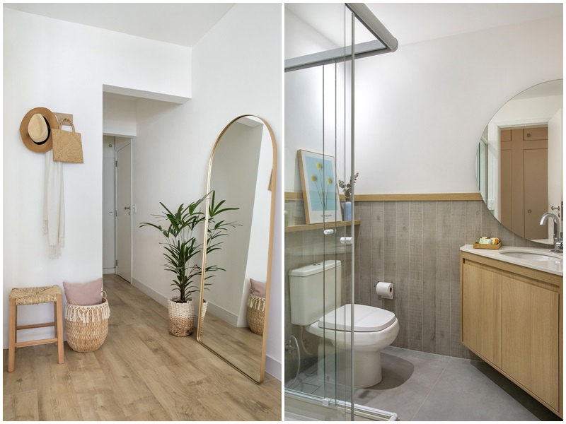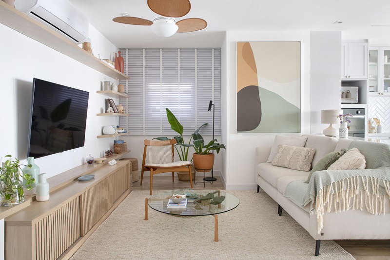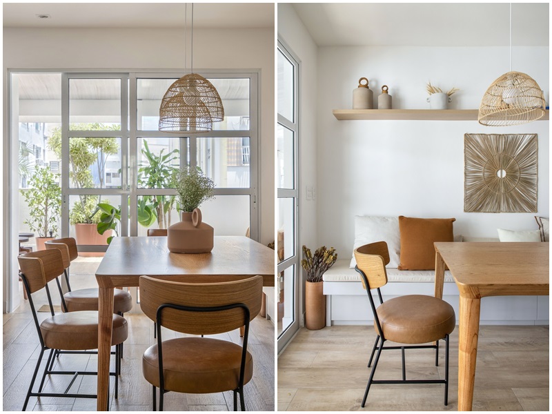 Segundo a arquiteta, o projeto foi inspirado em uma arquitetura de interiores que mescla elementos clássicos com atmosfera mediterrânea e estilo boho, resultando em ambientes neutros, claros e iluminados. Já os elementos de madeira e fibra natural cumpriram a função de deixá-los mais acolhedores. “Na decoração, é tudo novo. Nada foi aproveitado do endereço anterior”, informa Amanda.