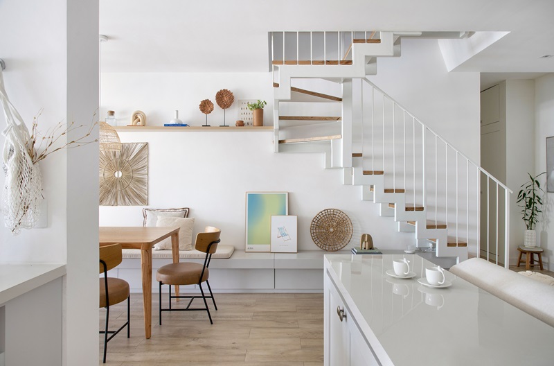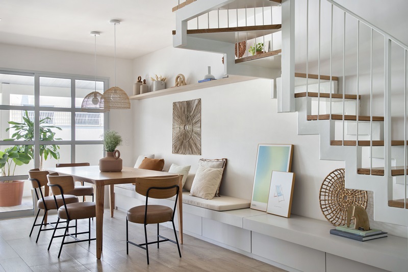 Na área social, a arquiteta destaca o extenso banco sob a escada (projetado por ela e executado em marcenaria), que atende a mesa de jantar e ainda conta com gavetas embaixo do assento para armazenamento. E, ainda, o canto de leitura instalado próximo à janela do estar com tv, ambientado com plantas, luminária de piso, prateleiras laterais e persiana de madeira pintada de branco.