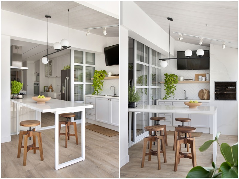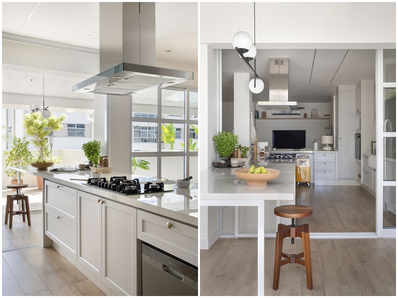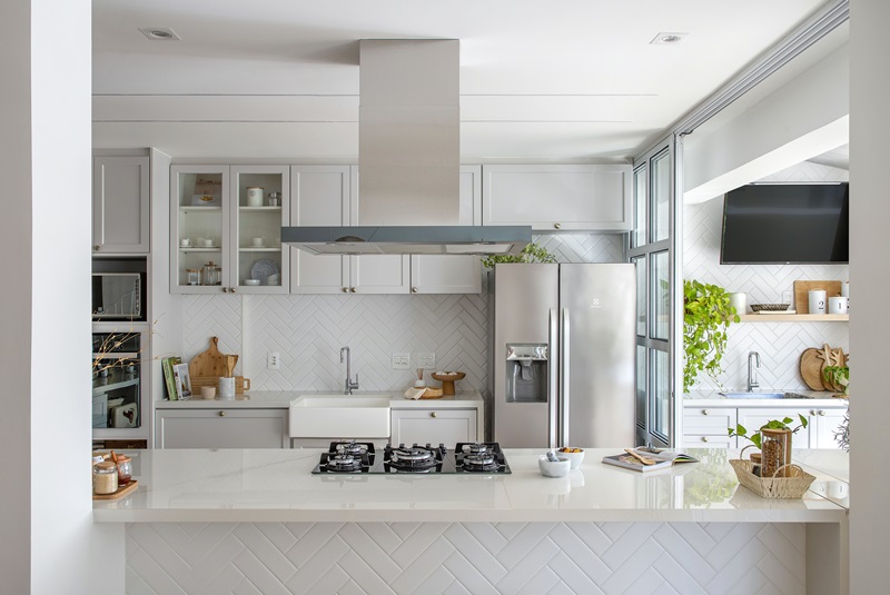 Na varanda gourmet, Amanda destaca o estilo levemente clássico replicado da cozinha e a mesa alta de refeições, que é uma extensão da bancada de porcelanato da cozinha. Repare como há um vão estreito entre elas para encaixar as portas de correr de esquadrias brancas com vidro transparente, que permitem integrar ou isolar os dois ambientes, de acordo com a necessidade.