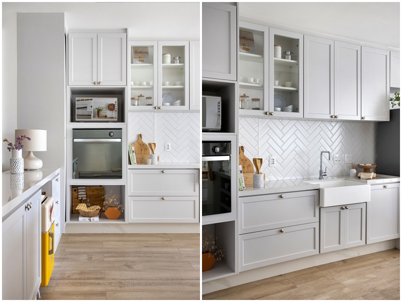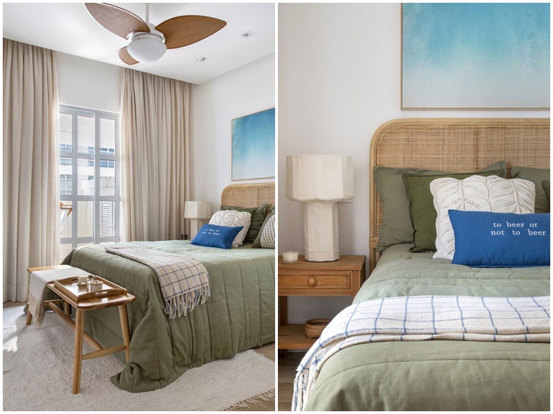 No quesito “paleta de cores, materiais e acabamentos”, a arquiteta destaca a bancada da cozinha de porcelanato com veios sutis em tons de cinza. Para contrapor aos armários brancos da cozinha e da varanda gourmet, a arquiteta usou porcelanato que imita madeira carvalho no piso de todo o apartamento com a intenção de ‘‘aquecer” os ambientes. As cores entram pontualmente no décor, sobretudo nos pequenos adornos em tons de verde acqua e terrosos. Para evocar o estilo boho, também foram usados alguns elementos de palha e madeira naturais.