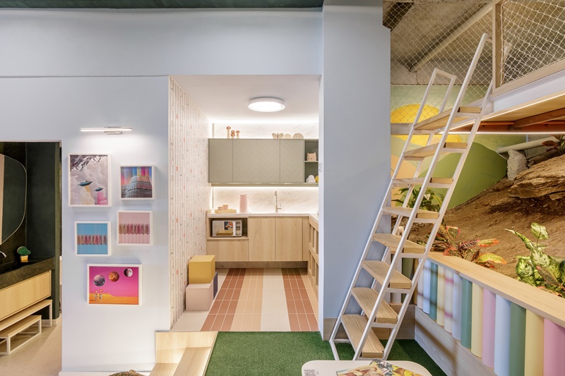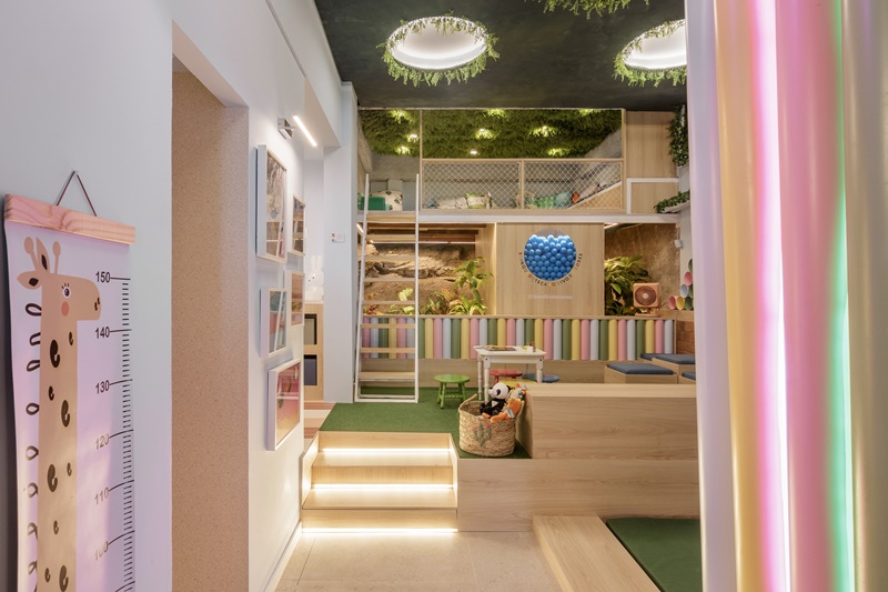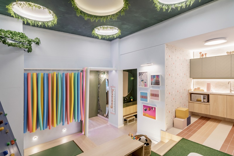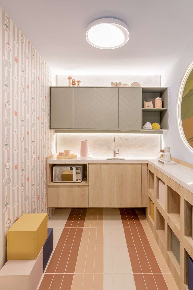 O espaço conta, além da parte da brinquedoteca, com cozinha e banheiro, dando a ideia de que os ambientes interligados ajudam, também, na independência da criança, encorajando os pequenos a criarem autonomia e confiança com pequenas tarefas, propícias à idade.