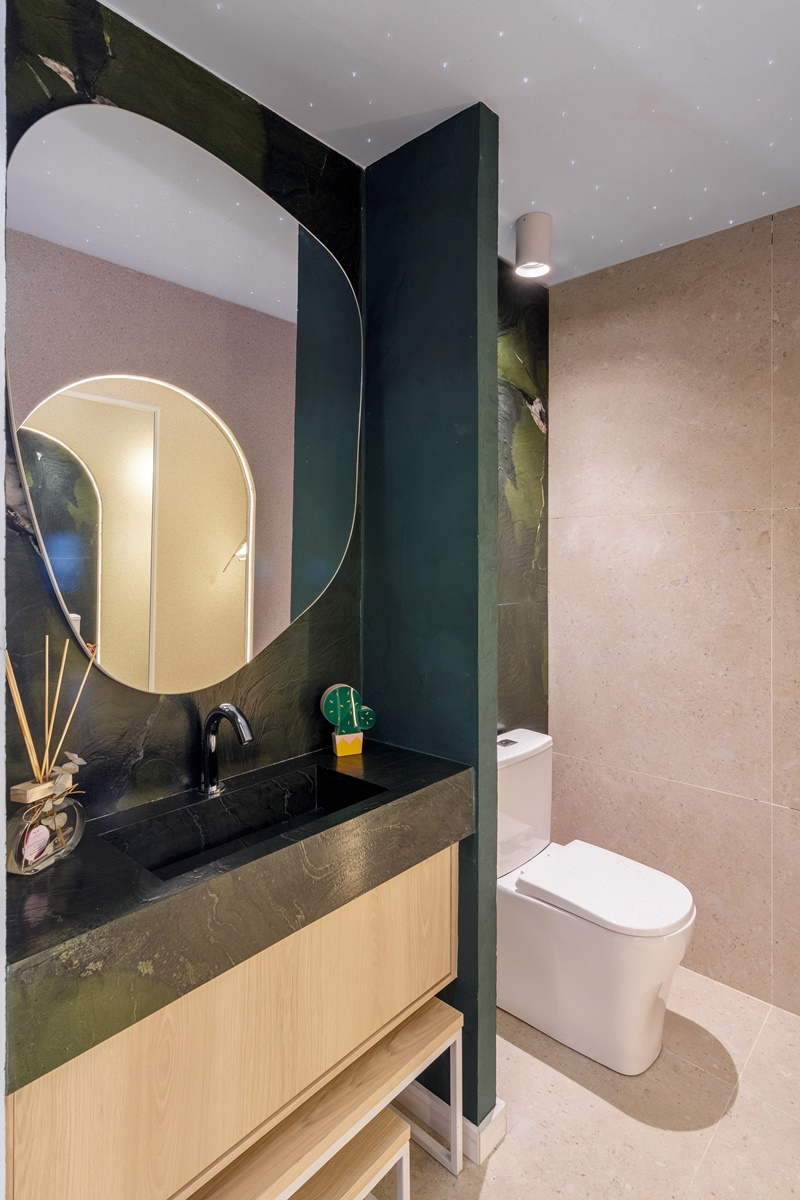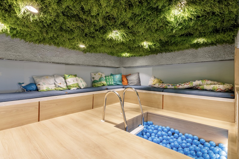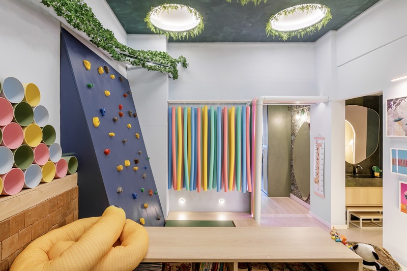 “Trouxemos o quintal para dentro de casa: de um teto imitando um céu estrelado a plantas por toda parte e parede de escalada, o ambiente é perfeito para promover a interatividade e ajudar no desenvolvimento da criançada, como a psicomotricidade”, explica Marcus.