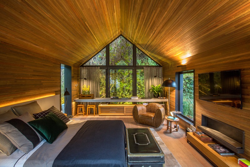 As Cabanas são feitas em módulos. Foram montadas em 15 dias e, em projetos residenciais, levam apenas dois meses. Têm construção seca e com desperdício zero; madeira de reaproveitamento; ventilação cruzada, captação de água da chuva para reutilização e energia solar.
