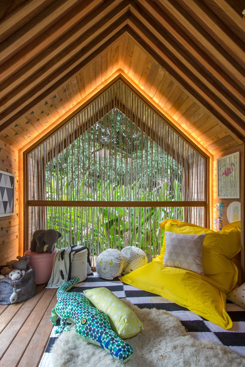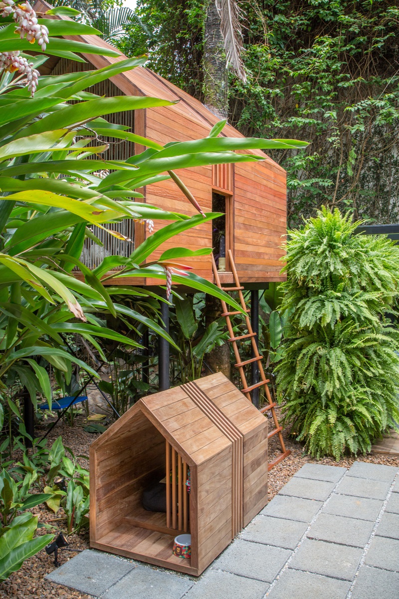 A casa na árvore e a casinha de cachorro também fazem parte do projeto. Amamos esses espaços!