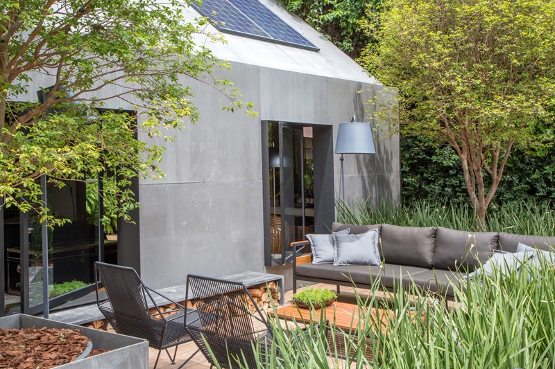 No gramado do casarão, um recanto se destaca: o loft em cimento, madeira e vidro, uma casa na árvore e uma casinha de cachorro. Com criatividade e sempre equilibrando estética e funcionalidade o arquiteto lança na mostra seu novo projeto. O protótipo de um empreendimento imobiliário que serve tanto para residências como para hotéis: uma casa em módulos que podem se conectar e ampliar de acordo com a vontade e a necessidade. Em linhas retas e minimalistas, a casa é realmente sustentável: construção que não provoca resíduo e tem desperdício zero; madeira de reaproveitamento; ventilação cruzada; captação de água da chuva para reutilização; e energia solar.