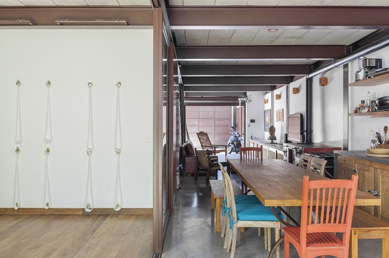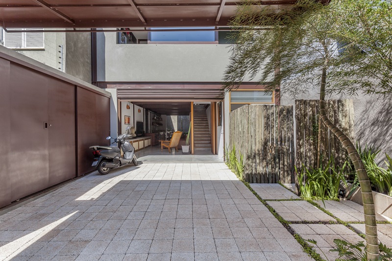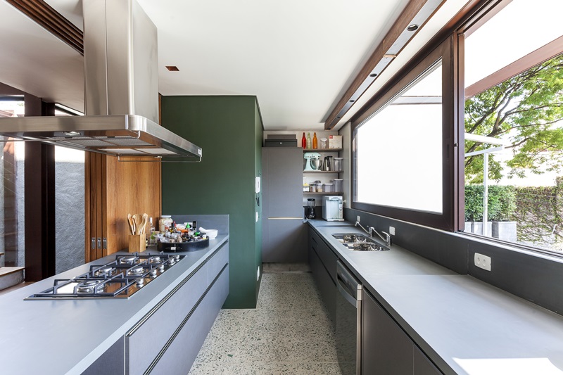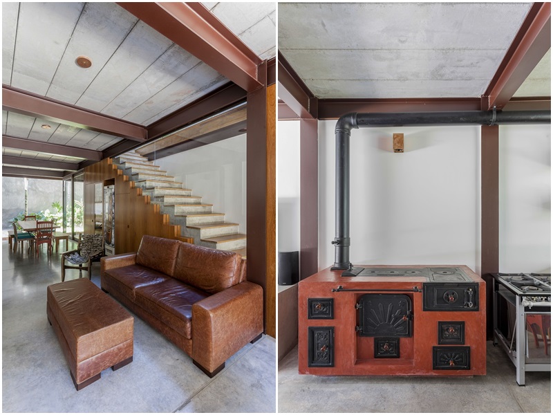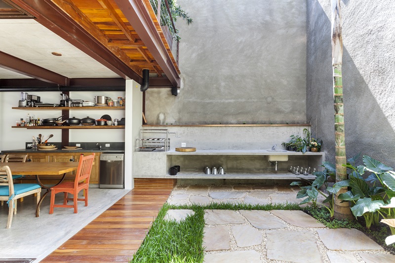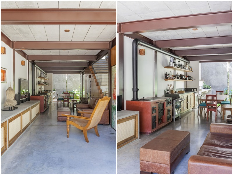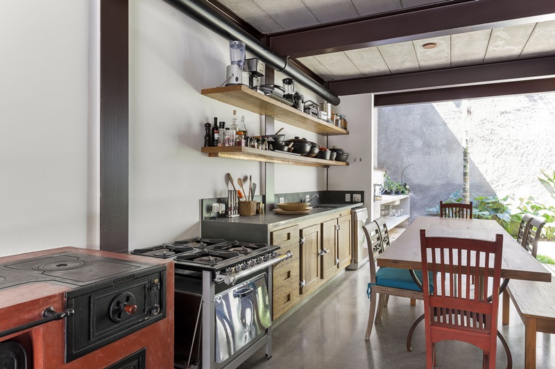 · Com laje e estruturas metálicas aparentes, o andar térreo concentra a área de lazer da casa, com direito a fogão industrial, fogão à lenha, churrasqueira e armários refrigerados (com a frente em madeira de demolição), além de sala de ioga, vestiário e um pequeno jardim com chuveirão. Neste andar também ficam o dormitório e o banheiro de serviço.