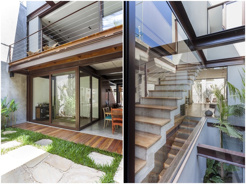 A casa tem estrutura metálica com acabamento na cor cortén, caixilhos de alumínio no mesmo padrão e portas internas em caixilhos de madeira. As escadas são de concreto com pisada de madeira, o gradil é ferro com cabos de aço e o piso é de concreto usinado no andar térreo e peroba-rosa de demolição nos andares superiores. Toda a marcenaria da casa foi desenhada pela arquiteta e executada pela Moreno Marcenaria.