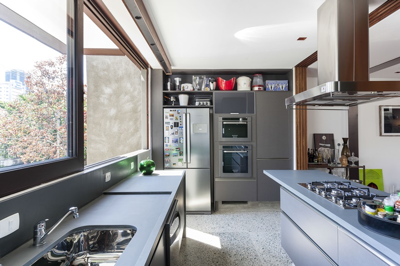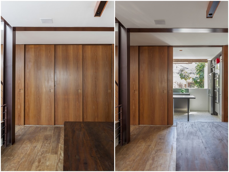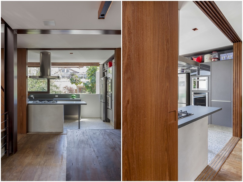 · O andar intermediário tem uma sala única com cozinha integrada (com portas de correr em madeira e piso concresteel), marcenaria com adega e bar, lavabo e terraço, tudo com bastante luz natural.