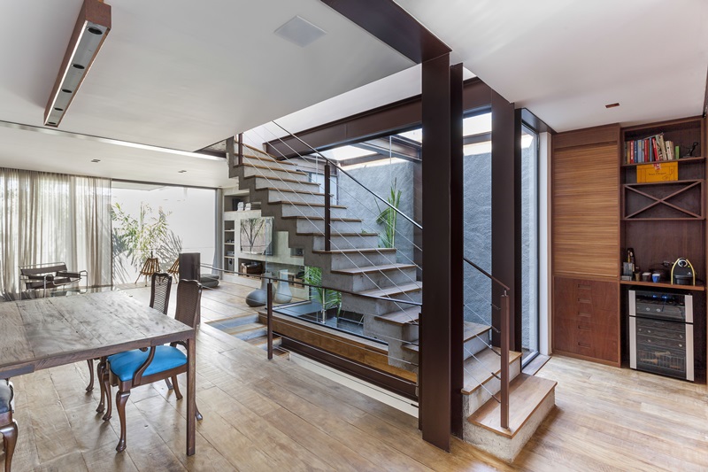 A casa foi projetada do zero para um casal entre 40 e 50 anos. Como o terreno é pequeno, o grande desafio da arquiteta Sandra Sayeg foi aproveitar ao máximo a área construída, sem perder a atmosfera de casa iluminada e ampla. Para isso, ela lançou mão de alguns recursos, como fazer um rasgo na projeção da laje da escada, além de um jardim interno (assinado por Mari Soares Paisagismo) envidraçado.