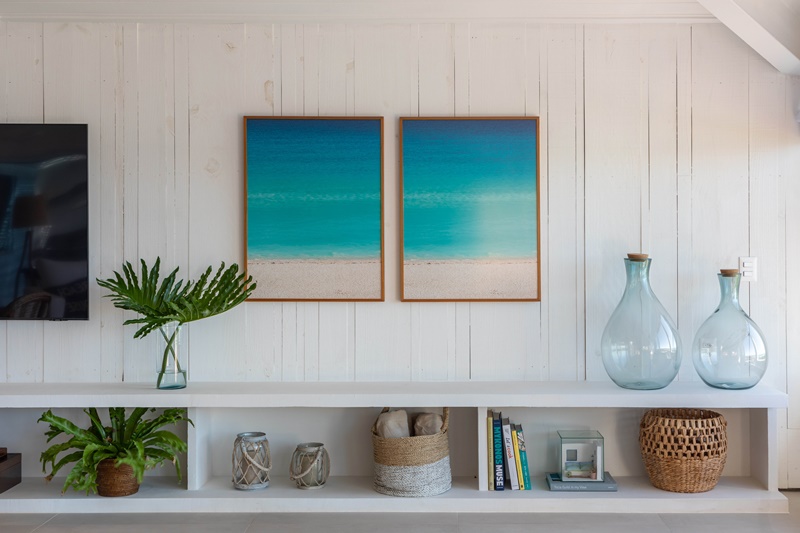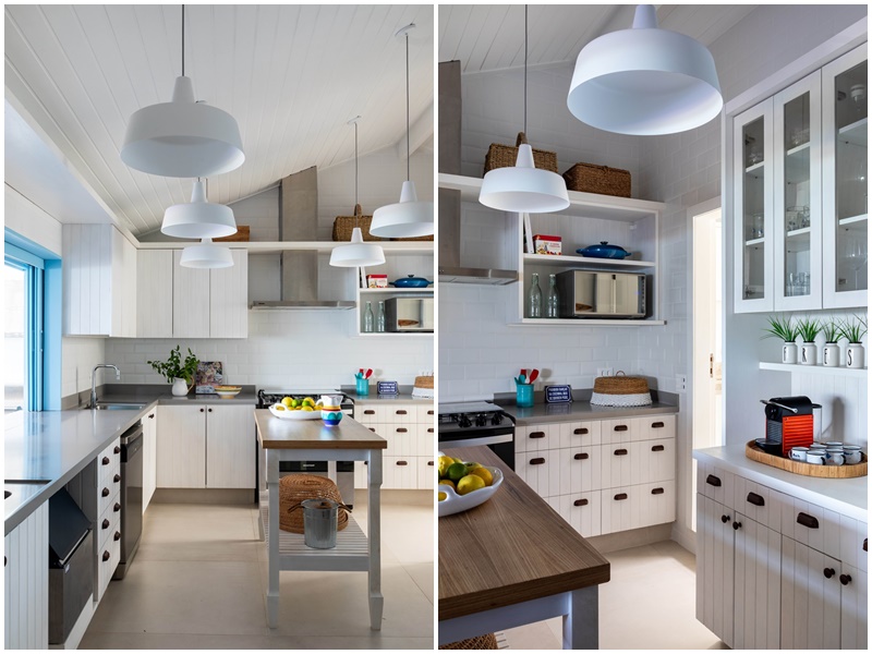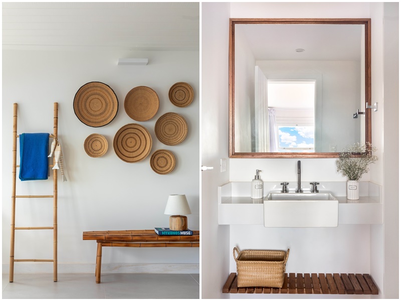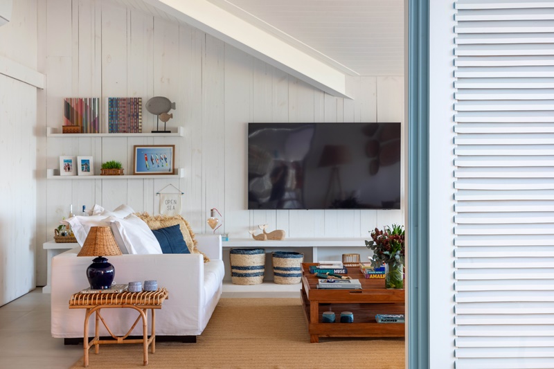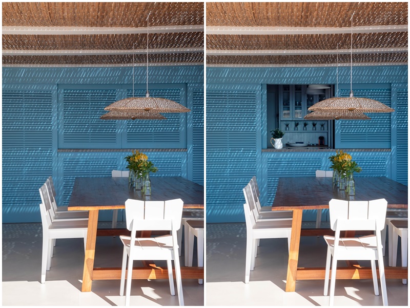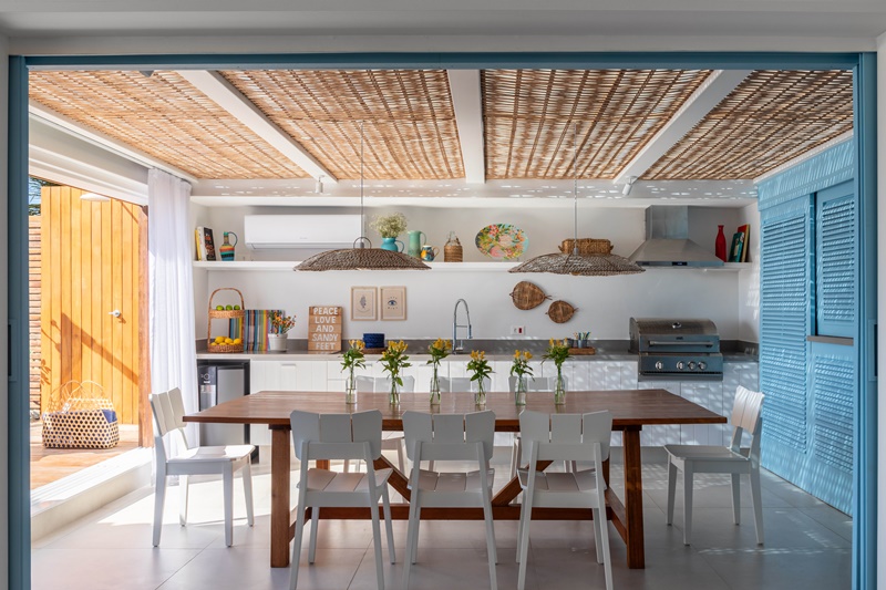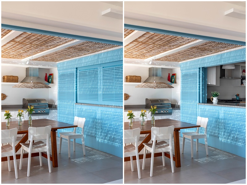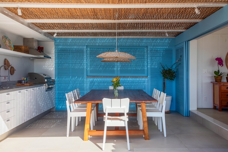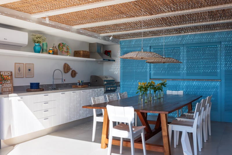 No geral, o clima de balneário chique foi traduzido pelas arquitetas através da combinação de paredes brancas, toques de azul e fibras naturais. Particularmente, a inspiração da área gourmet veio de uma viagem à Grécia que os clientes fizeram e amaram. As arquitetas os convenceram, então, a ambientar este espaço com venezianas azuis e um mesão de madeira rústica, com oito cadeiras brancas. “As venezianas se tornaram um ponto de cor em uma casa com decoração predominantemente neutra“, finaliza a arquiteta Cecília Teixeira.