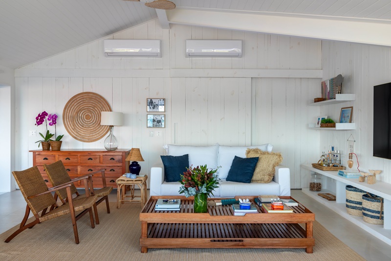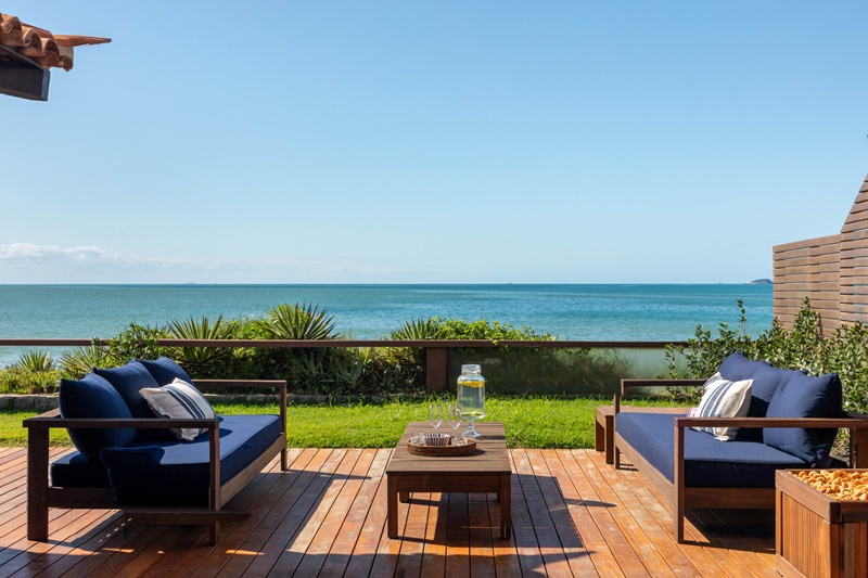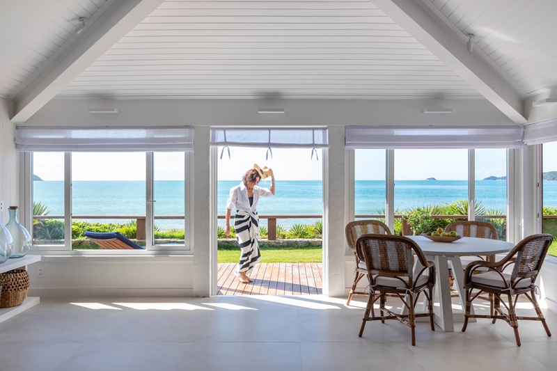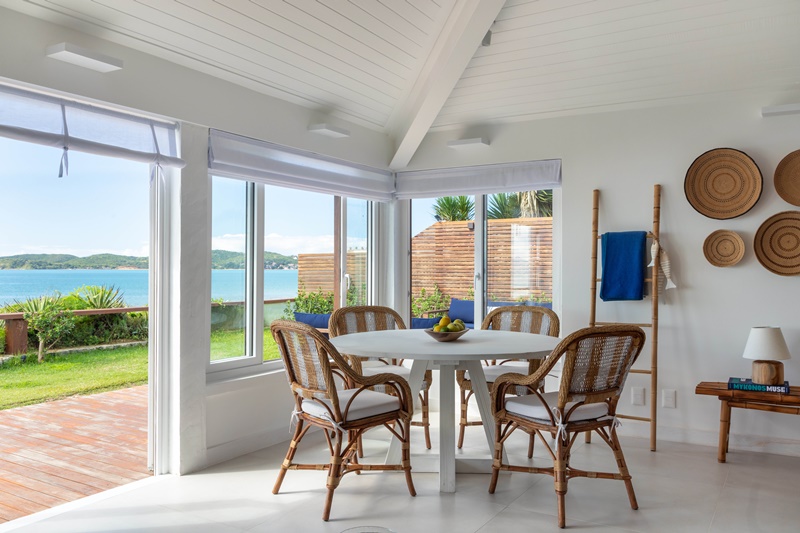 Localizada entre a nova cozinha e o deck voltado para a praia, a varanda transformada em área gourmet é, sem dúvida, a cereja do bolo do projeto. O espaço foi protegido com um pergolado e uma cobertura de vidro, forrada internamente com esteiras de palha. “Este recurso deixou o ambiente mais charmoso e acolhedor e, em termos práticos, ajuda a filtrar o excesso de luz solar, principalmente em dias de calor extremo“, informa Bitty.