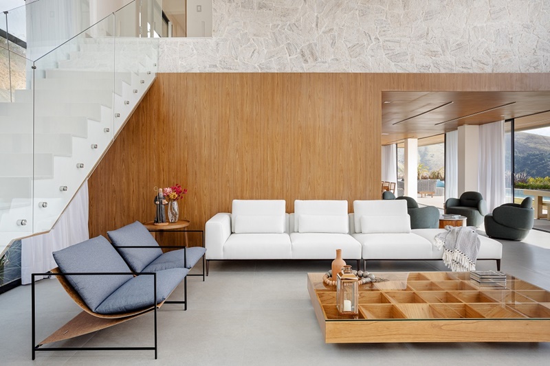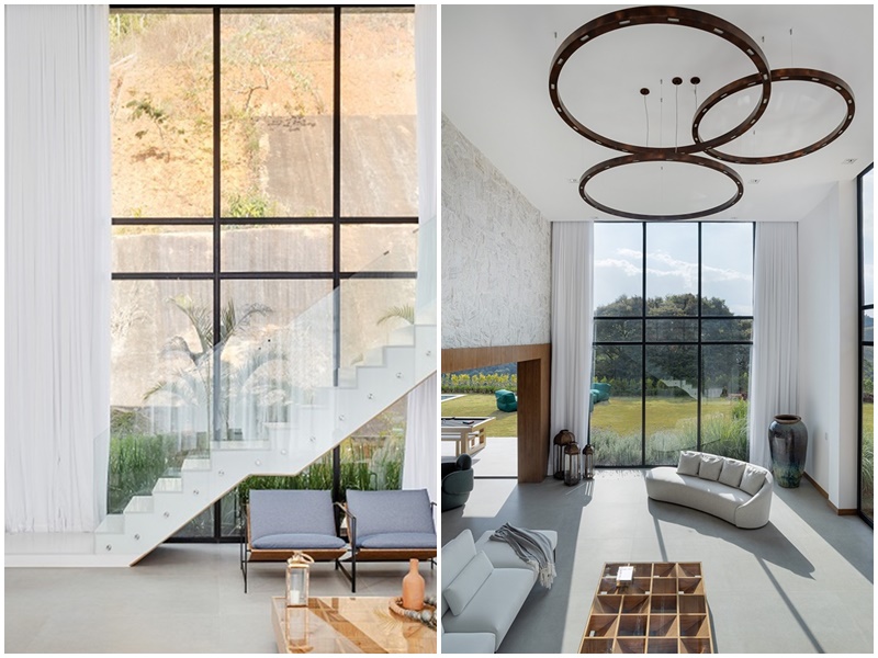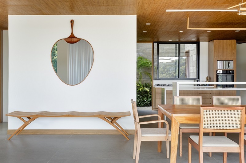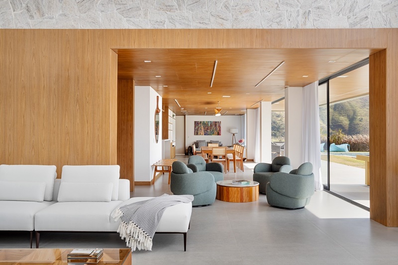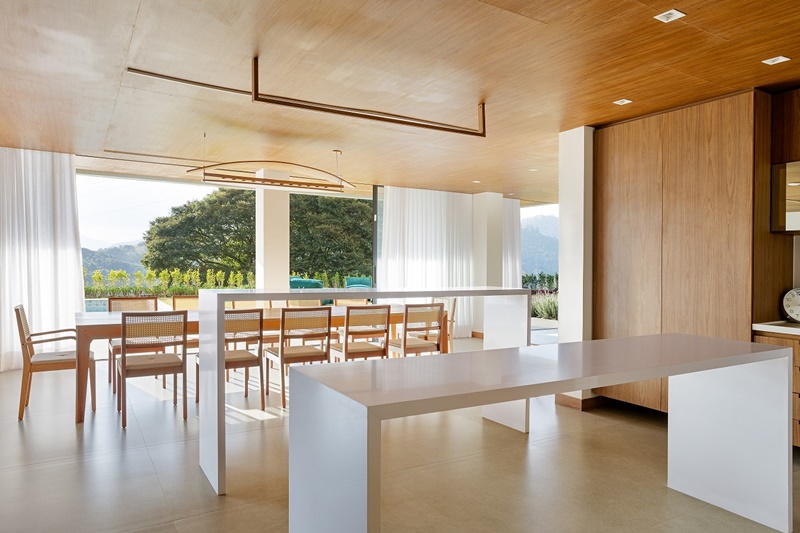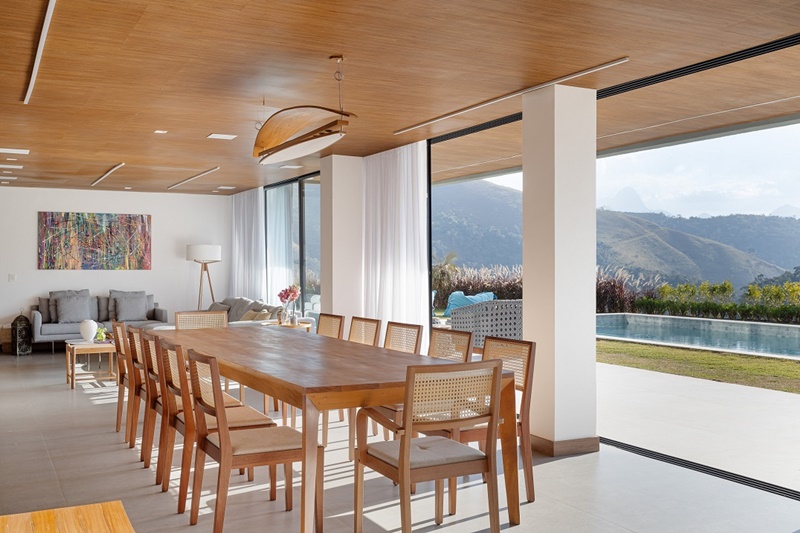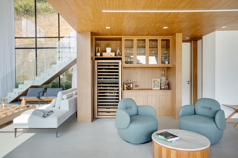 Mantendo essa proposta o primeiro pavimento é todo integrado: as salas de estar e jantar, cozinha e adega são conectadas física e esteticamente, já que todos ambientes receberam o mesmo piso e teto, sendo este em madeira, criando uma maior sensação de aconchego. Além disso, toda a fachada é envidraçada, criando elo entre ambientes interno e externo, com visão para a grande piscina.