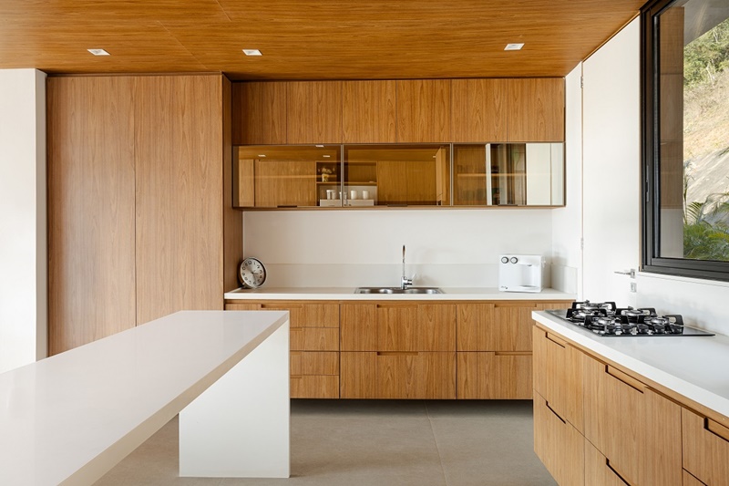 A casa, construída onde o platô era mais largo, foi pensada como um grande bloco, em que a entrada se dá pela lateral e a fachada principal é virada para a frente. Do outro lado, há um bloco vertical.