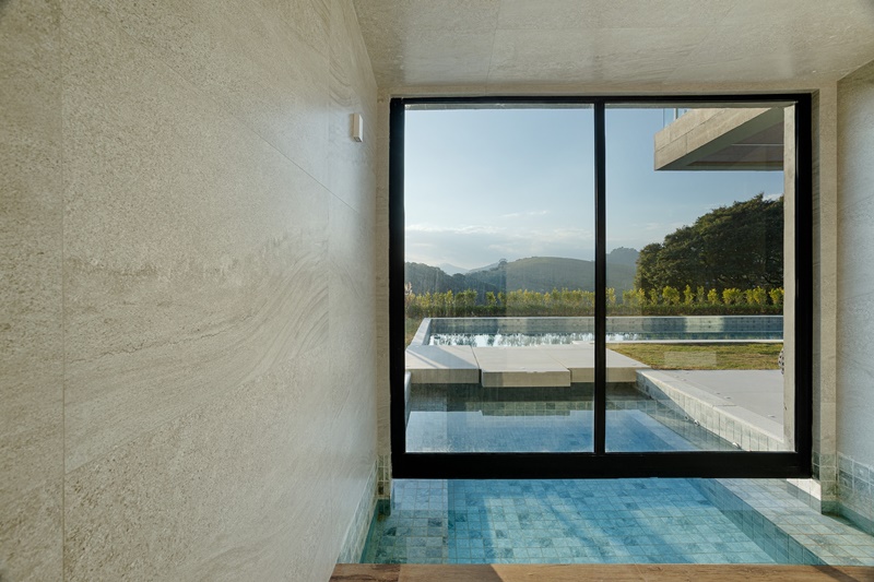 A casa foi construída toda integrada: do interior é possível acessar área gourmet e piscina – há uma passagem na sauna que conecta o interior com a piscina, mantendo a água aquecida.